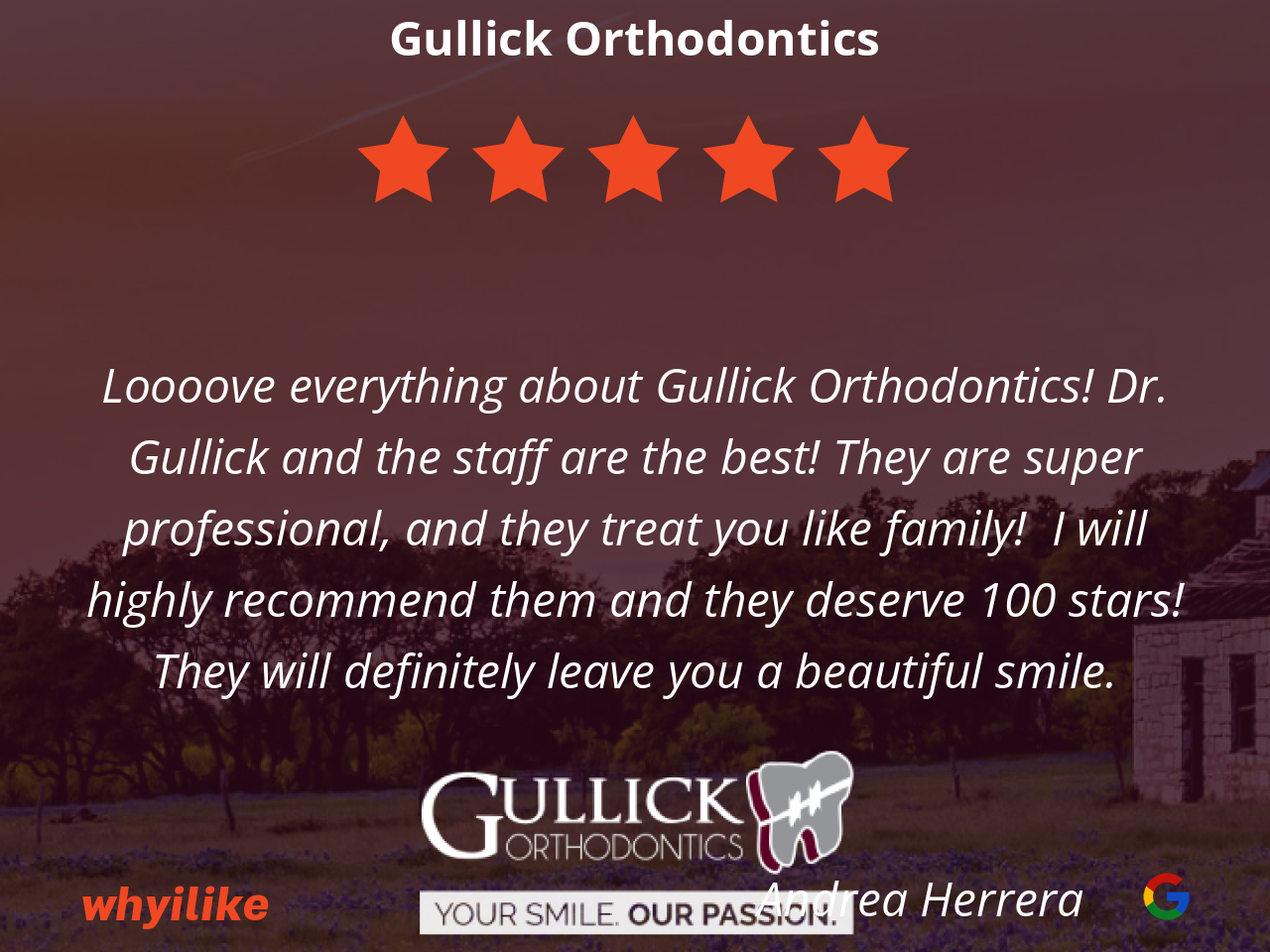 Loooove everything about Gullick Orthodontics! Dr. Gullick and the staff are the best! They are super professional, and they treat you like family! I will highly recommend them and they deserve 100 stars! They will definitely leave you a beautiful smile.