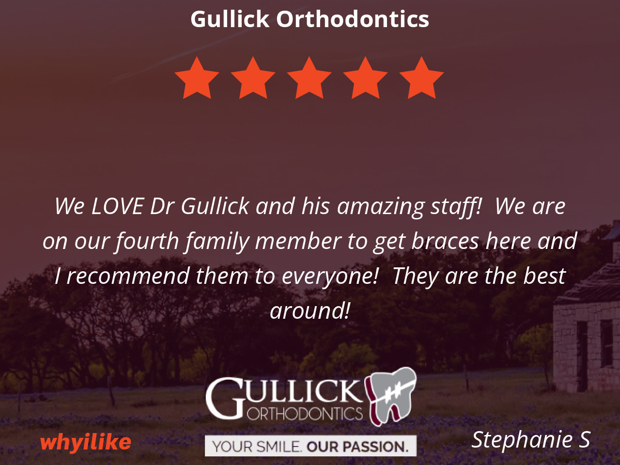 Loooove everything about Gullick Orthodontics! Dr. Gullick and the staff are the best! They are super professional, and they treat you like family! I will highly recommend them and they deserve 100 stars! They will definitely leave you a beautiful smile.