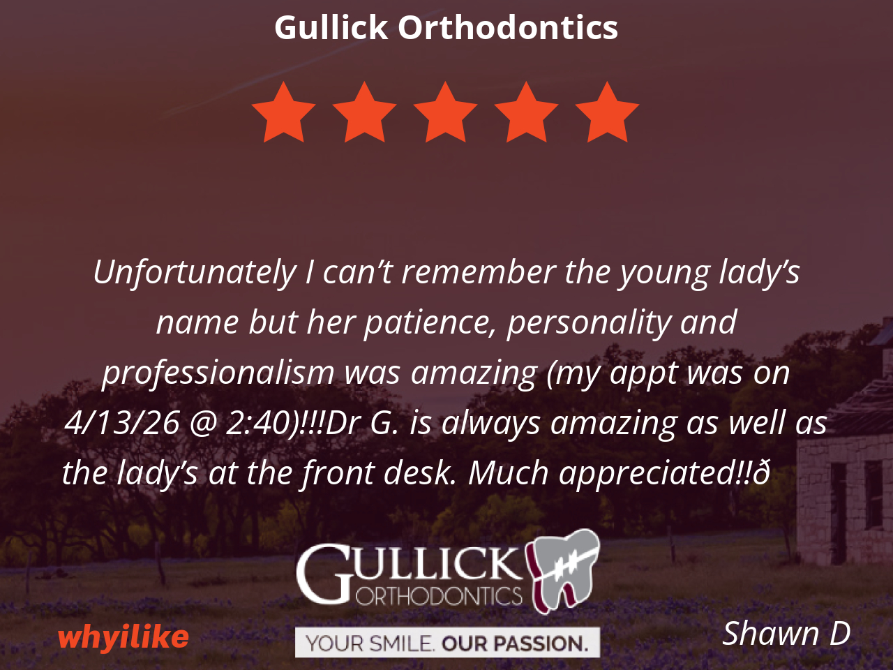 Loooove everything about Gullick Orthodontics! Dr. Gullick and the staff are the best! They are super professional, and they treat you like family! I will highly recommend them and they deserve 100 stars! They will definitely leave you a beautiful smile.