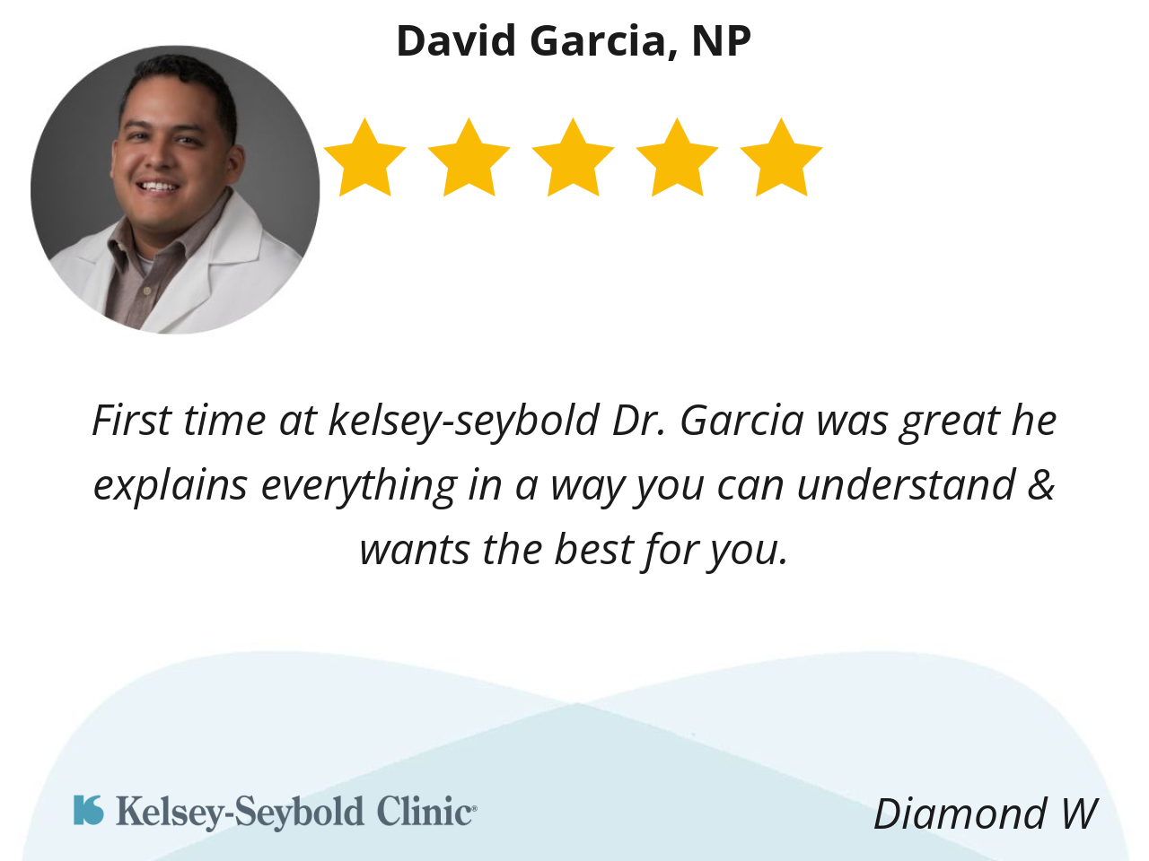 First time at kelsey-seybold Dr. Garcia was great he explains everything in a way you can understand & wants the best for you.