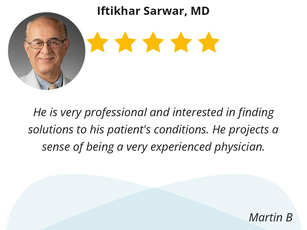 Dr. Lftikhar Sarwar is extremely knowledgeable and truly cares about your wellbeing, he took the time to explain in detail what my next steps should be in order to recover and get healthy again. He also explained medication side effects, pros and cons. Dr. Sarwar opened my eyes about my health and gave me several referrals ensuring I am receiving complete care and that nothing is being overlooked. I definitely appreciate his dedication and knowledge.
