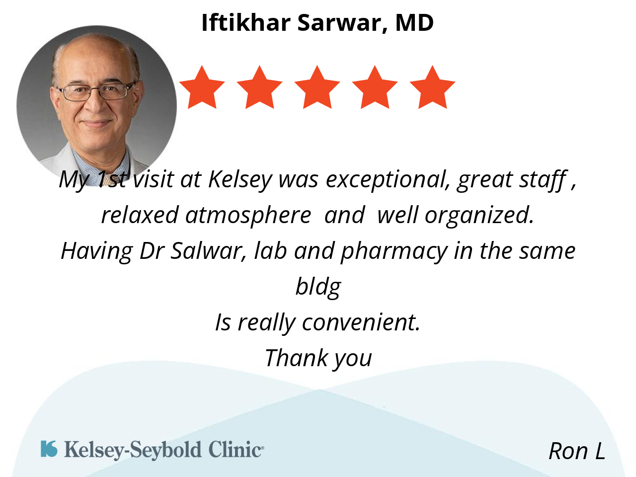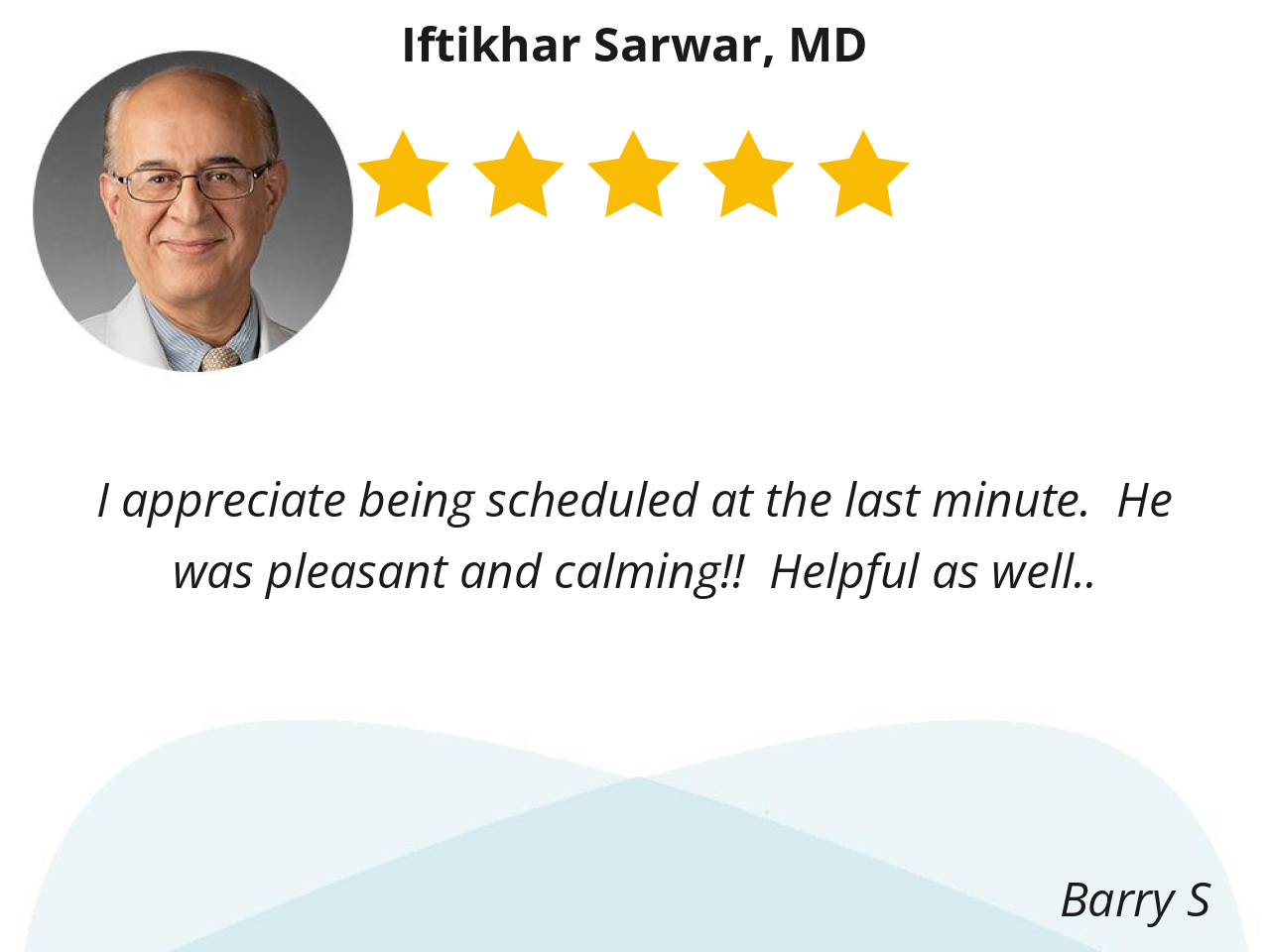 I have been seeing Dr Sarwar for years. Love him. He has treated me through the years with respect and kindness. Has also treated all my aches and any issues I have had through my aging process. As a matter of fact my husband also has him as his primary doctor. We both love him.