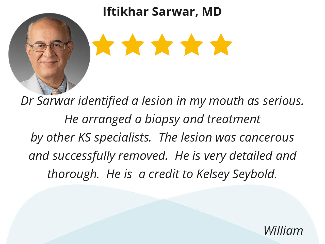 Dr Sarwar identified a lesion in my mouth as serious. He arranged a biopsy and treatment