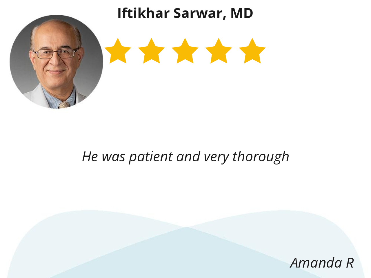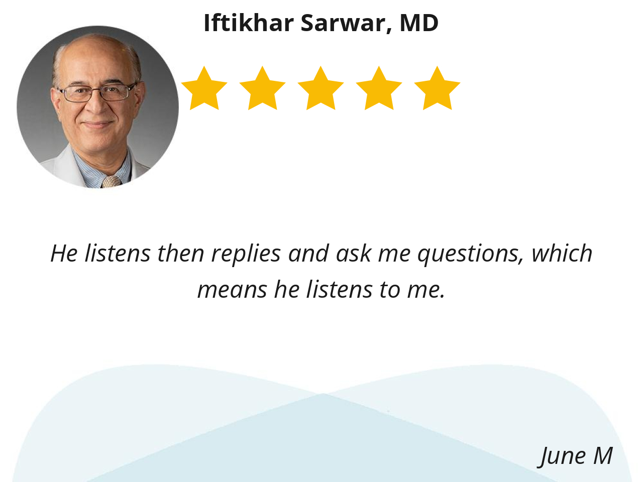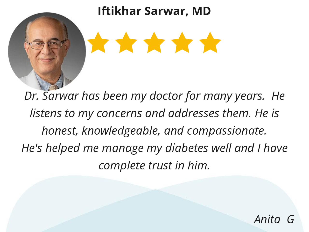 Dr. Sarwar has been my doctor for many years. He listens to my concerns and addresses them. He is honest, knowledgeable, and compassionate.