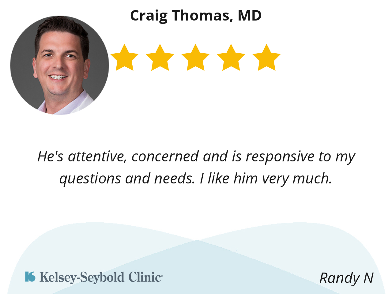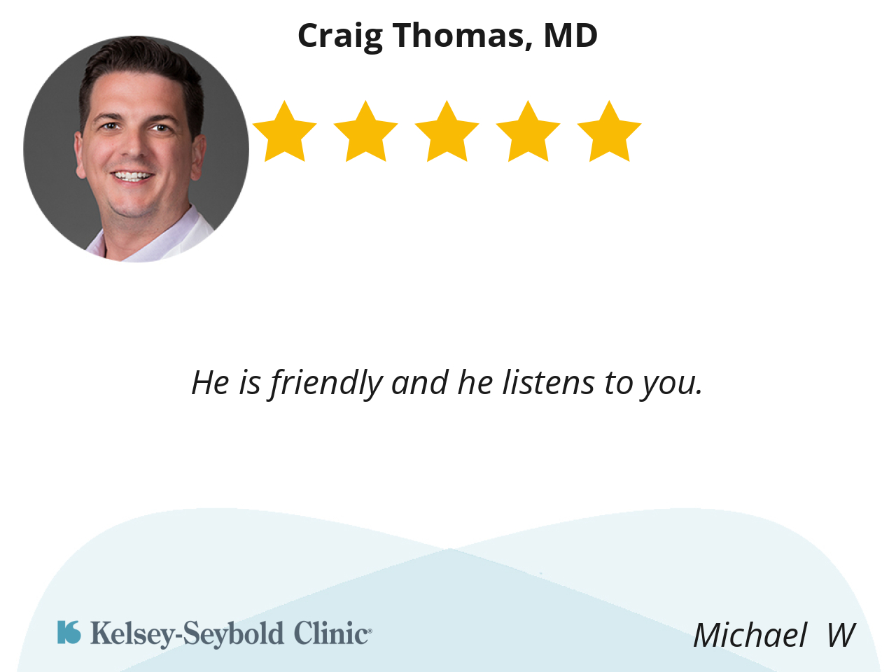 All doctor at kelsey Seybold are wonderful ..I hated to leave the North Campus ..But the clinic Dr Craig Thomas M.D. work at is more convenient for me ..it is very close to my home .Dr Steven Thomas he is very thorough and all way help me..Dr Craig Thomas is very nice he listens to me well and tell me what is going on with me..and is very kind .