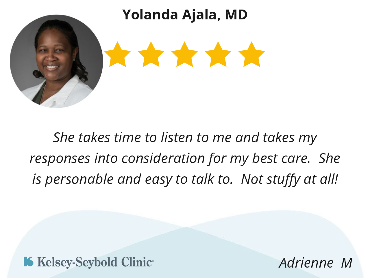 I love Dr Ajala personality and her passion for healthcare. I do not dread coming to see the Doctor since Dr Ajala is a great listener, caring and honest.