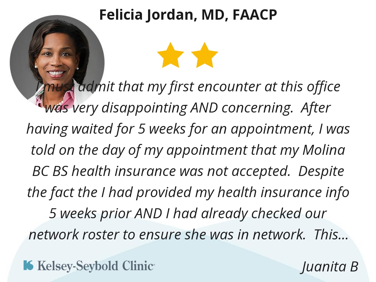 Dr. Jordan is kind and she listens to my concerns. She is the first doctor that I have found that hears me and I feel that she has my best interest and cares what I feel and think. She makes me feel comfortable.