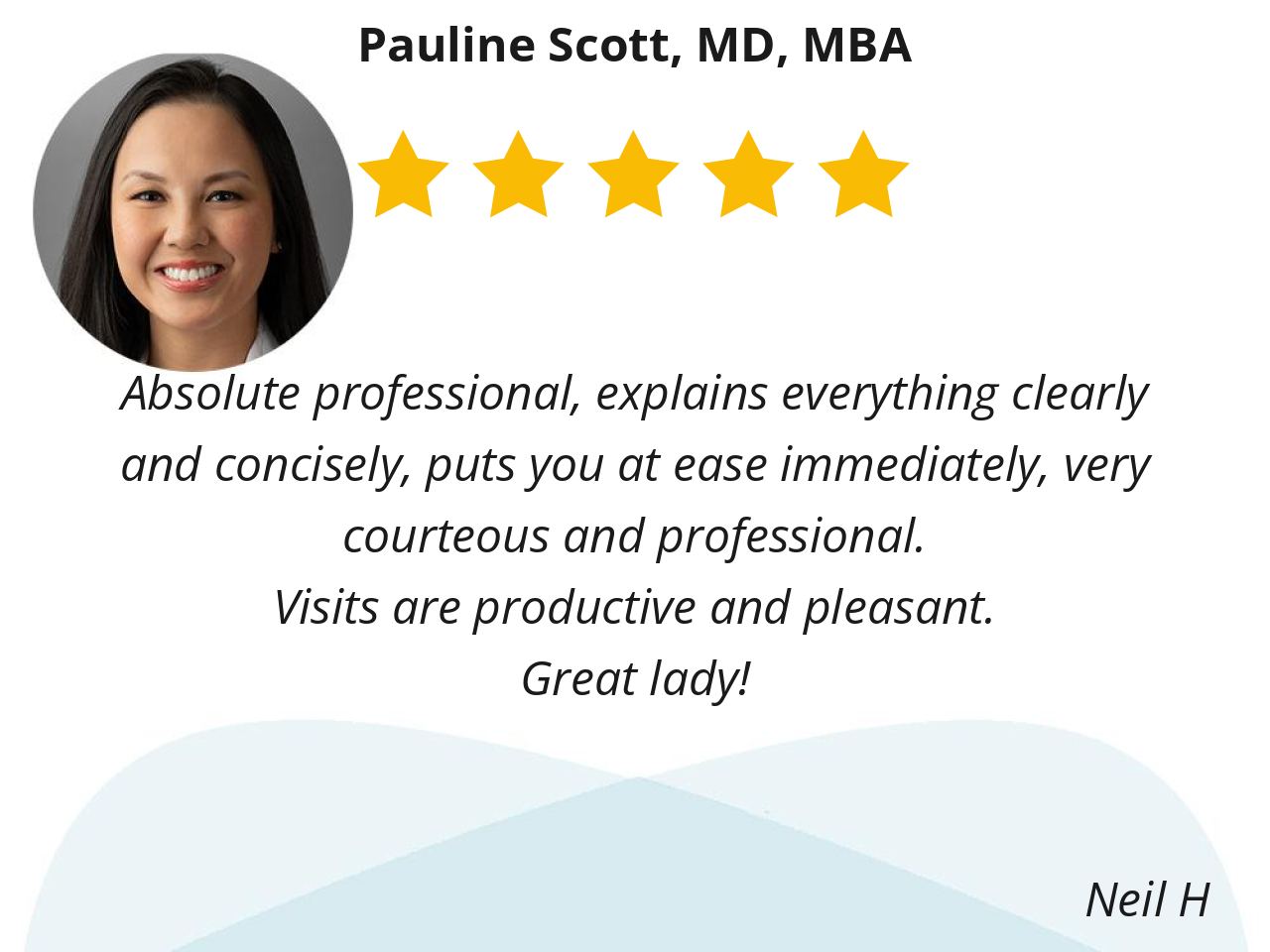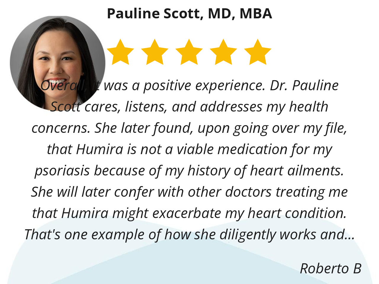Overall, it was a positive experience. Dr. Pauline Scott cares, listens, and addresses my health concerns. She later found, upon going over my file, that Humira is not a viable medication for my psoriasis because of my history of heart ailments. She will later confer with other doctors treating me that Humira might exacerbate my heart condition. That's one example of how she diligently works and cares for her patient.