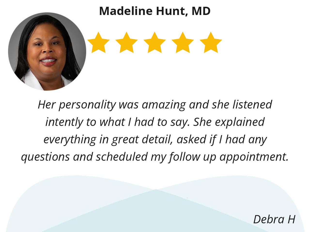 Dr. Hunt is very professional but also is easy to talk to and very empathetic.