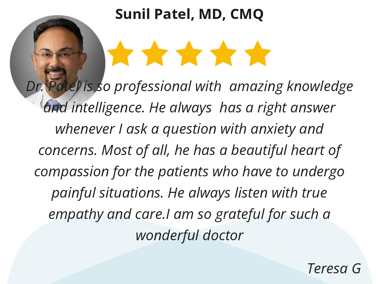 Dr. Patel is so professional with amazing knowledge and intelligence. He always has a right answer whenever I ask a question with anxiety and concerns. Most of all, he has a beautiful heart of compassion for the patients who have to undergo painful situations. He always listen with true empathy and care.I am so grateful for such a wonderful doctor