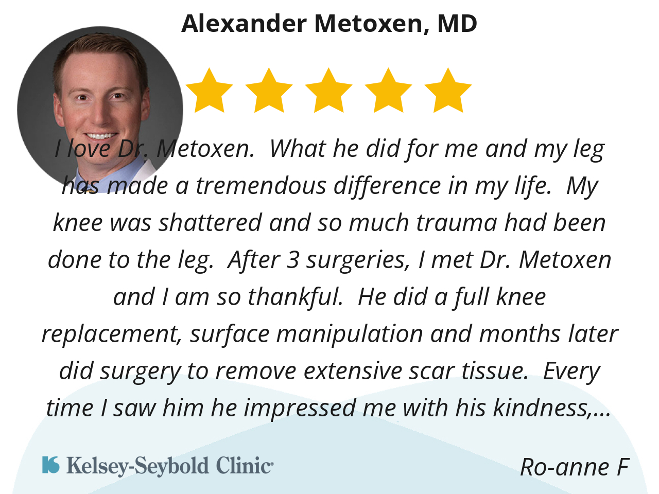 I love Dr. Metoxen. What he did for me and my leg has made a tremendous difference in my life. My knee was shattered and so much trauma had been done to the leg. After 3 surgeries, I met Dr. Metoxen and I am so thankful. He did a full knee replacement, surface manipulation and months later did surgery to remove extensive scar tissue. Every time I saw him he impressed me with his kindness, patience and his amazing way to communicate. He gave me my life back.