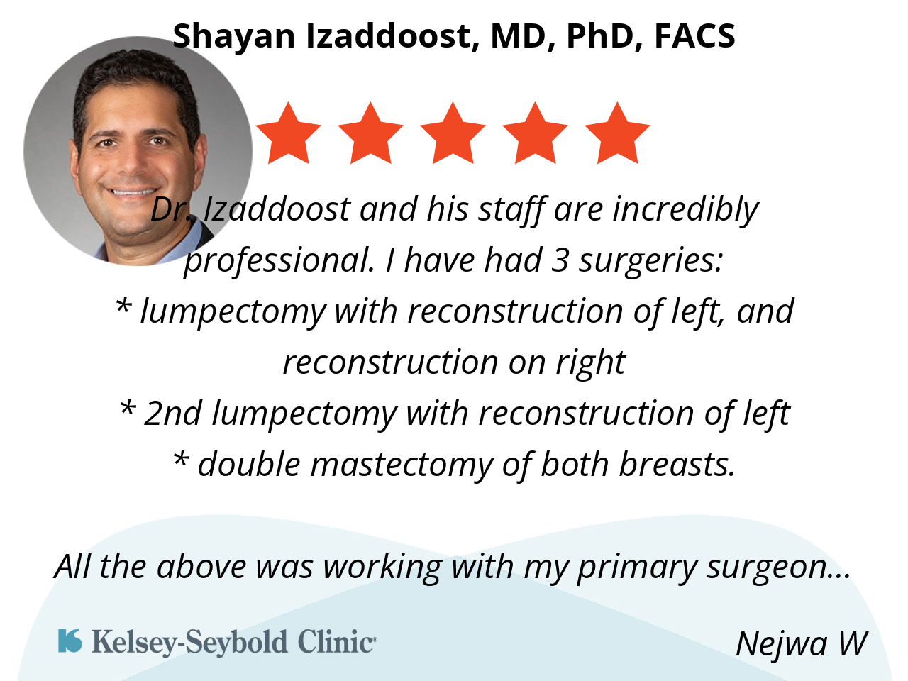 All the above was working with my primary surgeon for the cancer, and Dr. Izadoost for the reconstruction. He answers all questions, and ensures understanding for every appointment. He has done a wonderful job of taking care of every single issue I have been presented with in this process.