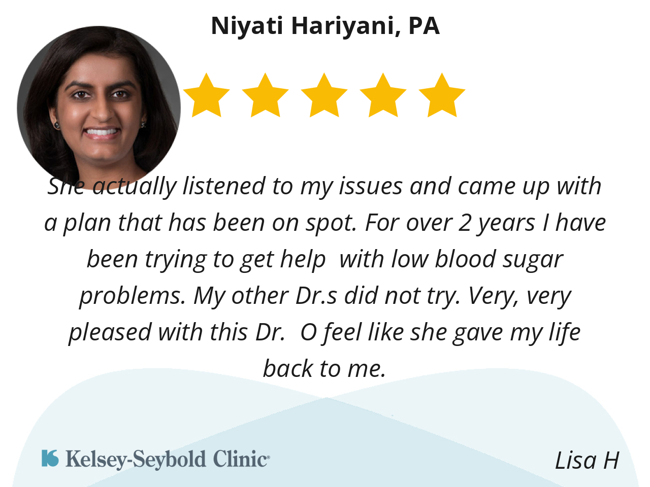 Niyati Hariyani, PA is a wonderful provider. She answers my questions and really takes her time. I never feel rushed or unheard. I feel like she really wants to help me and has my wellbeing a priority. I wish a lot more providers were able to instill this confidence.