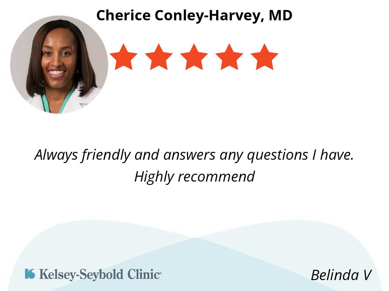 I love Dr. Conley-Harvey as my doctor! There is a Kelsey-Seybold clinic 5 minutes from my house and I refuse to go there because she doesn't work there! She listens, provides great advice, guides with preventative measures. I refer to all my friends looking for a phenomenal doctor!