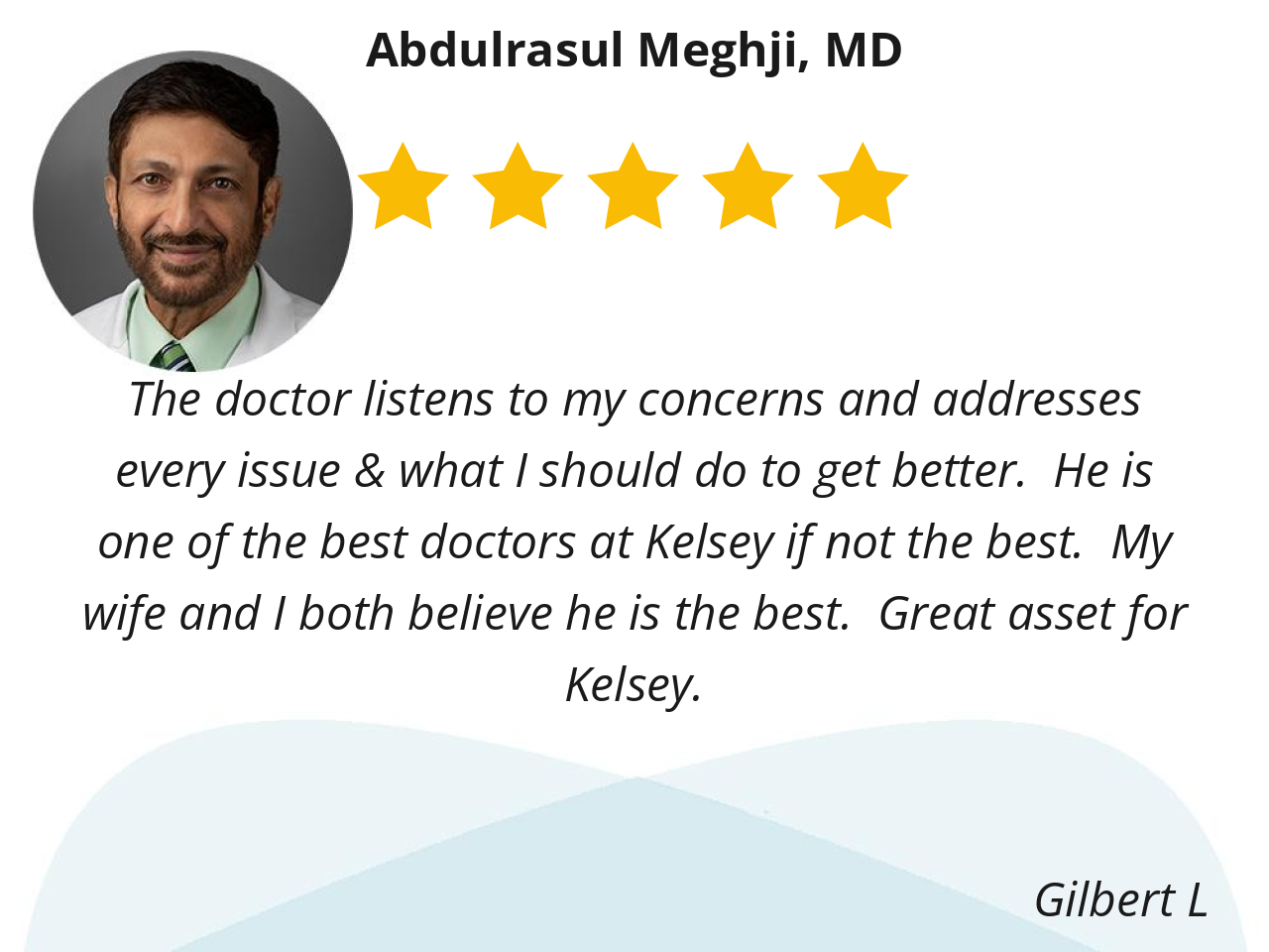 The doctor listens to my concerns and addresses every issue & what I should do to get better. He is one of the best doctors at Kelsey if not the best. My wife and I both believe he is the best. Great asset for Kelsey.