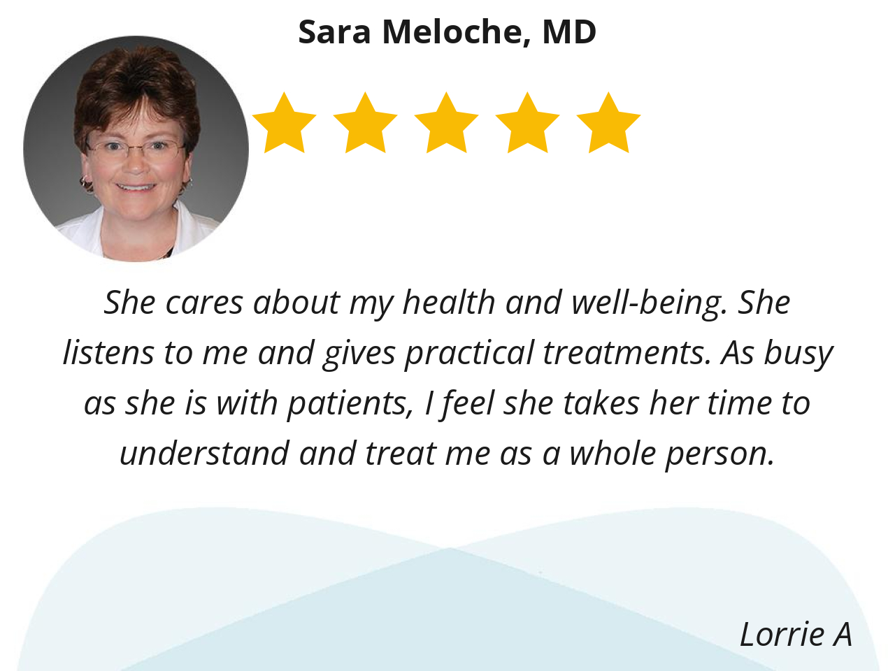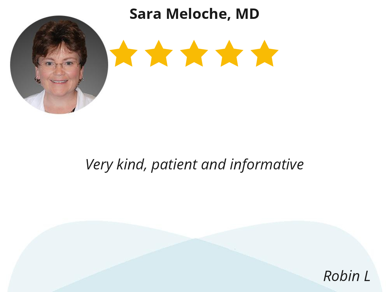 Dr. Meloche...is a special doctor she will take the time to talk to you about all your many questions and concerns. She speaks to you in words that you can understand (a regular persons language). This is a real gift to a patient to walk away from their appointment and understand all that has been conveyed to them. Dr. Meloche is absolutely wonderful. A great physician and communicator.