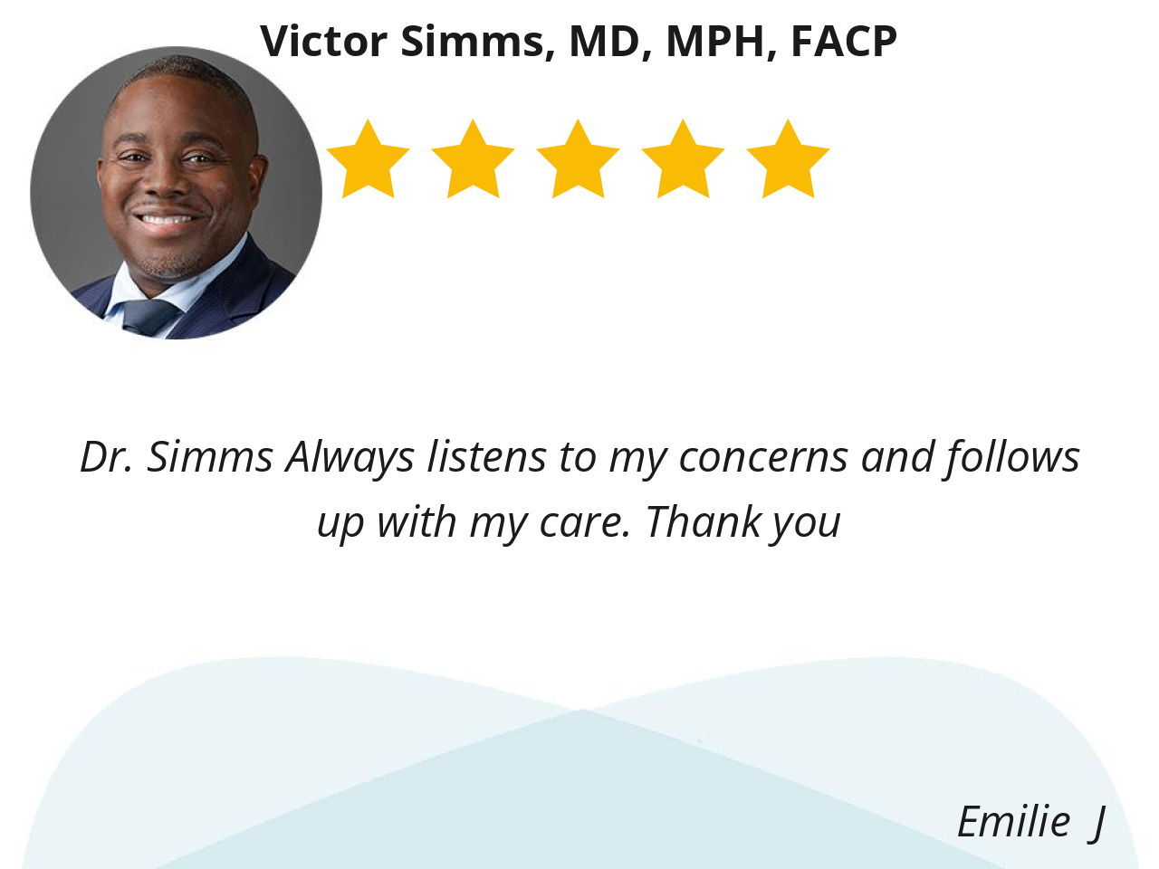 Dr. Simms Always listens to my concerns and follows up with my care. Thank you