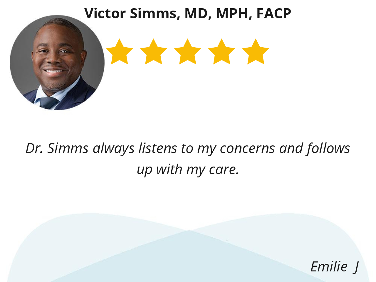 Dr. Simms is truly exceptional! He takes the time to listen, provides thorough explanations, and ensures I feel supported and informed. I couldn’t ask for a better doctor —highly recommend!