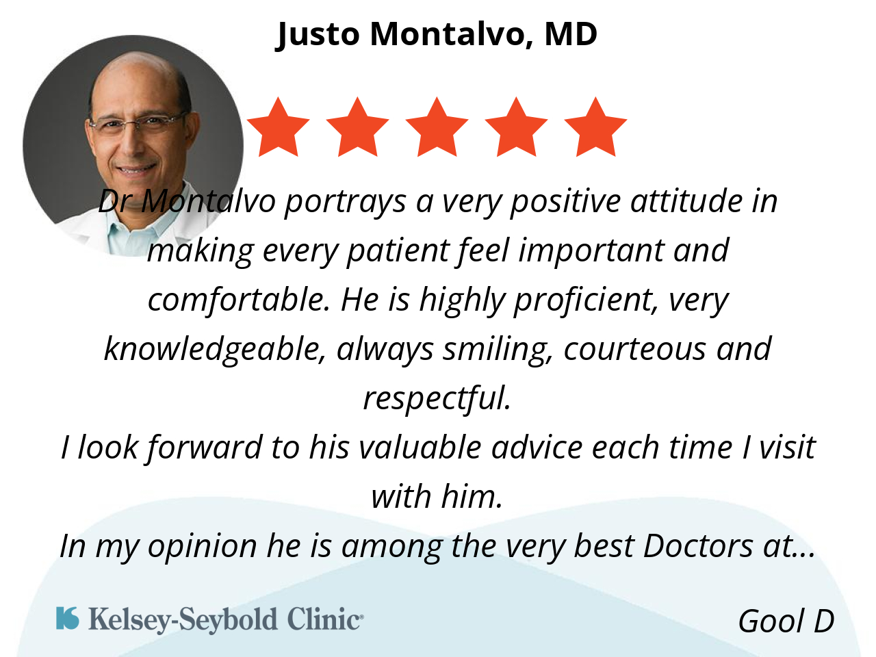 Who’s !!! He had been my number one favorite doctor since l became his patient at his Department for 3 years . I am very happiest for choose him as my Ophthalmologist and l looked in good health condition and l am surprised to hear that Ophthalmologist is very good as normally . I m greatfull to Almighty God that I am in good health and l m very grateful to my my doctor , so l’d like to return back next year because l truly love the Clinic as my number one best’ of the best doctors , is Kelsey -Seybold Clinic of our Houston community as a whole. Thank you. Thanks to Kelsey-Seybold Client. .
