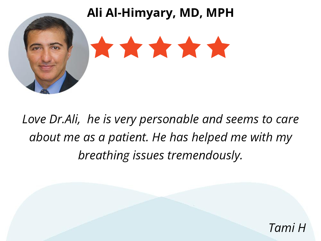 Love Dr.Ali, he is very personable and seems to care about me as a patient. He has helped me with my breathing issues tremendously.
