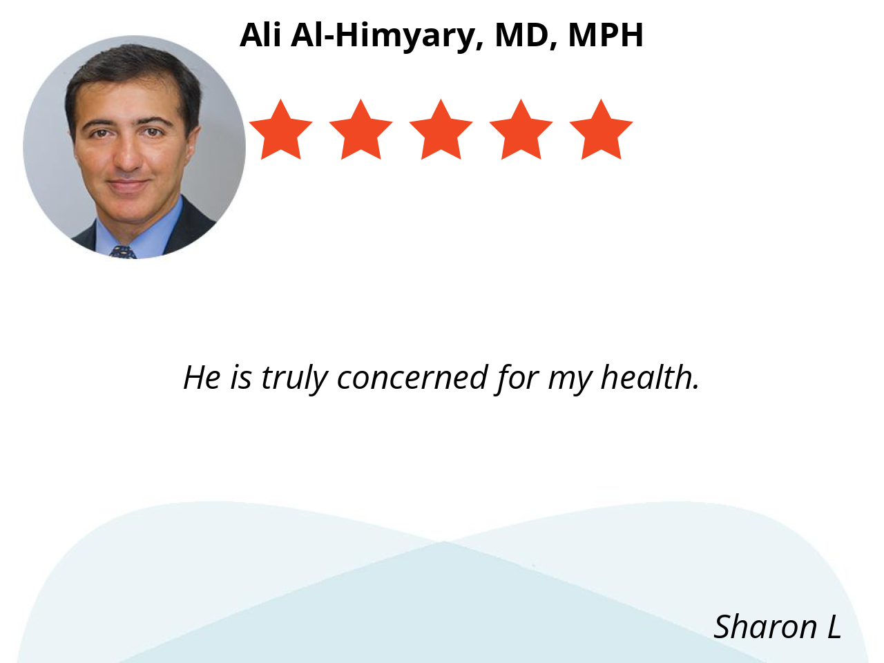 First and foremost Dr. Al assured me l was not going to die from what he was treating me for. And that was a real concern for me. And secondly l believed in him and trusted his judgement based on the diagnostic test he ordered and his commitment to his craft. Dr. Al listened to me and heard me, he didn’t over talk me. His ability to disarm my fears gave me calm , l was not rushed in or out and l did not feel like a one night stand. I TRUST HIM… This is my personal experience