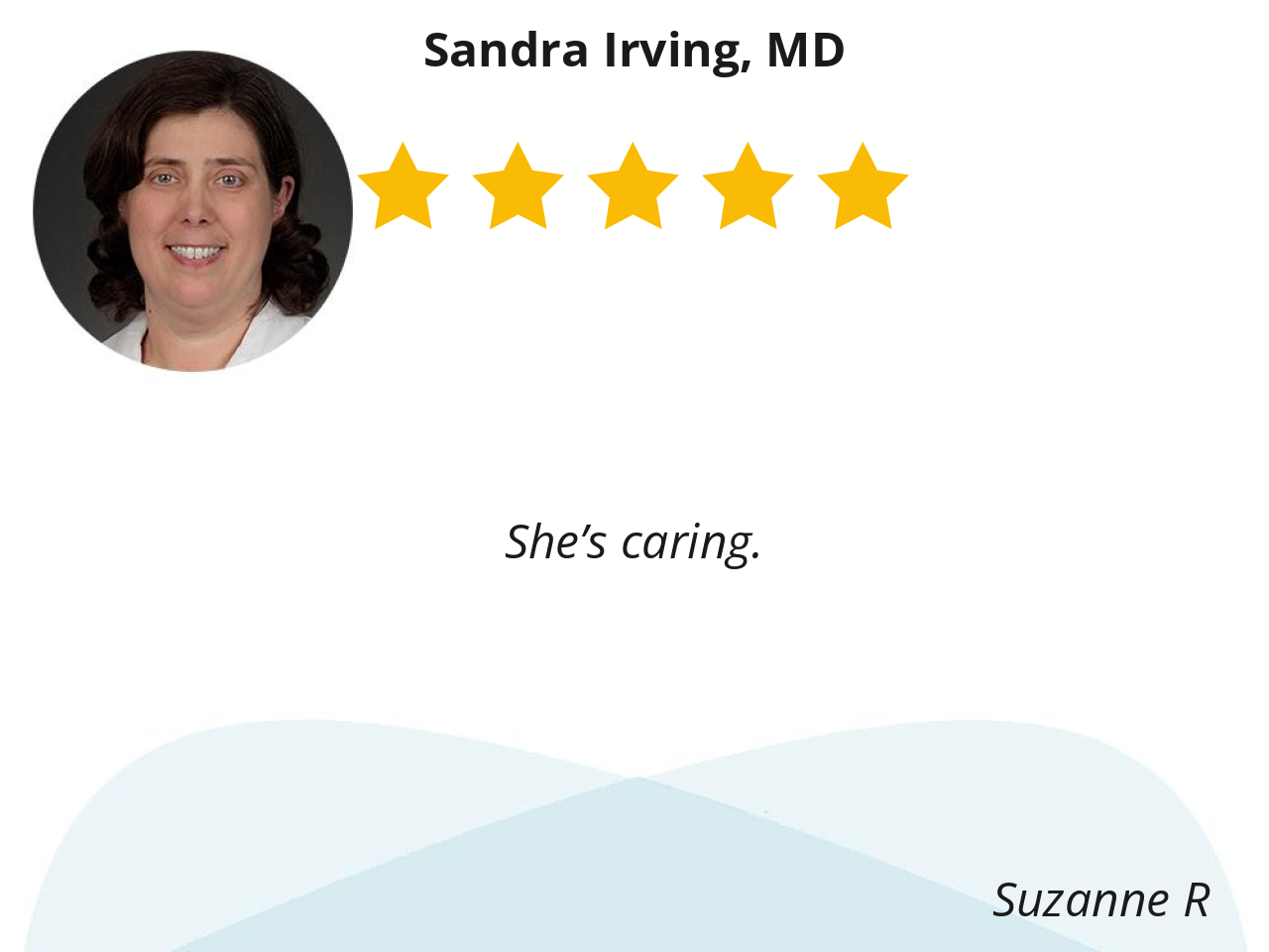 I like Dr. Irving because she is always courteous, very smart, likable and gets me taken care of in a timely manner but NEVER rushes.
