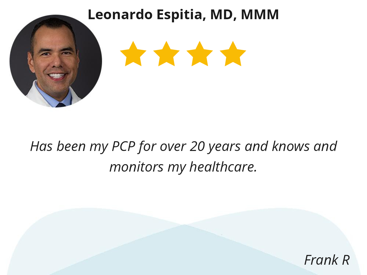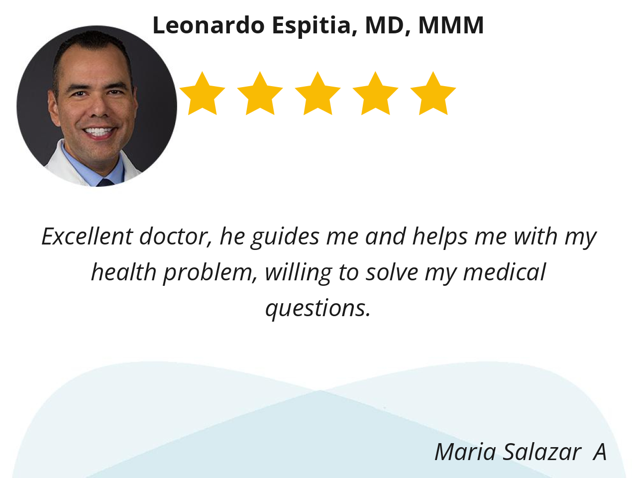 I’ve been a patient of Dr. Espitia since early 2006, and to us, he feels more like a friend. As my primary doctor, he has always taken excellent care of our medical needs. His professionalism and diligence stand out, especially in how he coordinates with other great doctors to ensure my well-being. I truly thank him and offer my kudos. Thank you for being my doctor—my doctor for life.