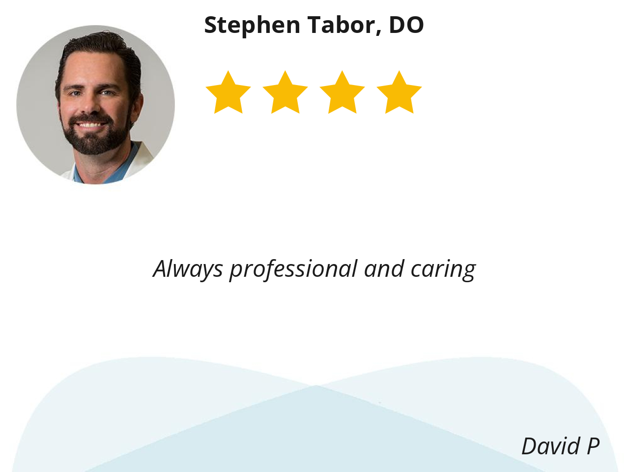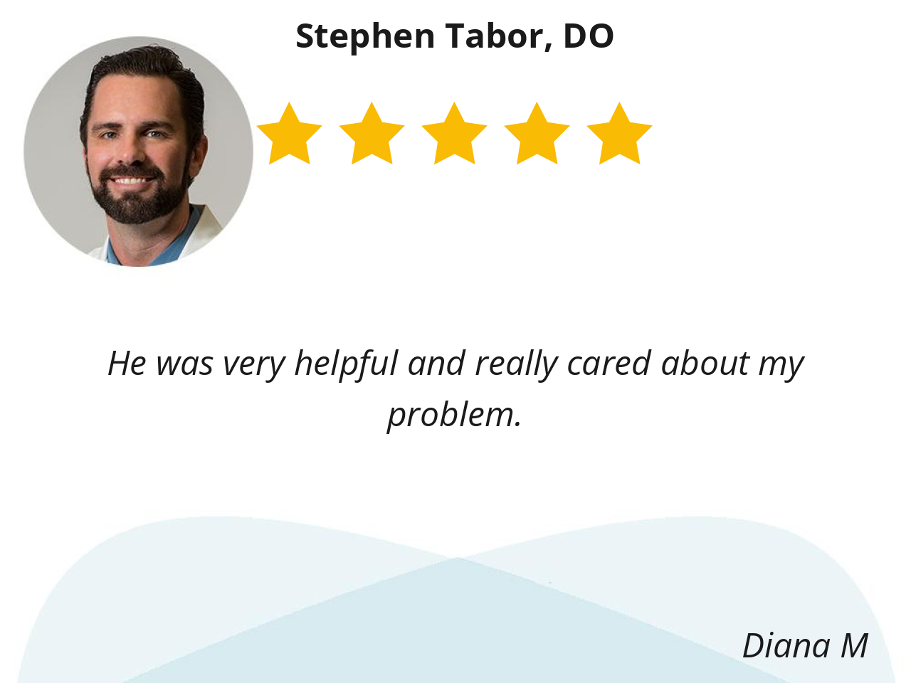 Dr. Tabor listens to my concerns. He offers treatments and solutions with compassion and interest in my well being. Friendly, kind and on time for appointments!