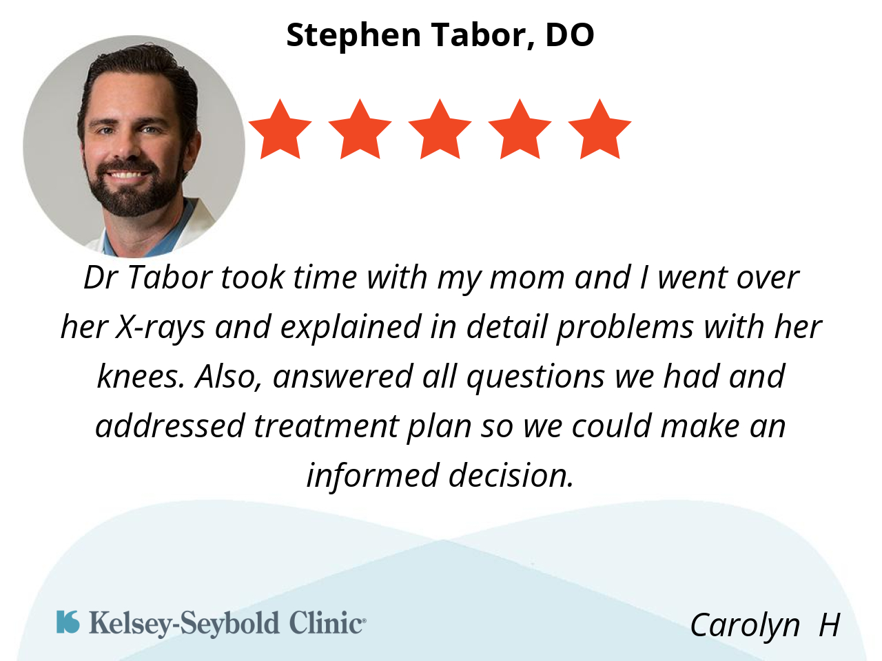 Dr Tabor took time with my mom and I went over her X-rays and explained in detail problems with her knees. Also, answered all questions we had and addressed treatment plan so we could make an informed decision.