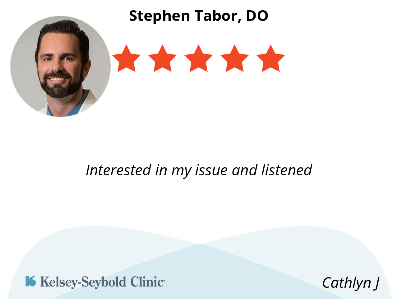 Dr. Tabor was very friendly and listened to my concerns and ordered X-rays immediately. He explained why my wrist was in pain. He showed me and explained the X-ray images that he ordered. I had an appointment scheduled for 2:30 pm but I was at Kelsey-Seybold with my wife the morning of the day of my appointment. I asked a lobby desk attendant if I could see Dr. Tabor while I was there and I was being called in to see him within just a few minutes. I really appreciated his demeanor. His assistants were very personal and made me feel at ease.