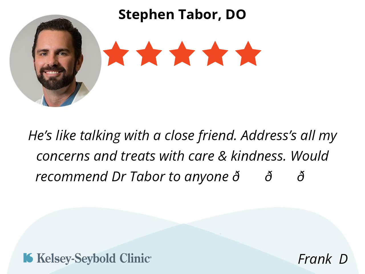 He’s like talking with a close friend. Address’s all my concerns and treats with care & kindness. Would recommend Dr Tabor to anyone 👍👍👍