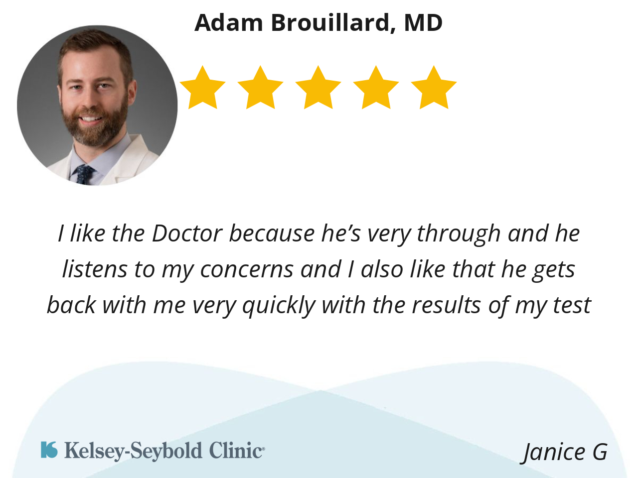 I like the Doctor because he’s very through and he listens to my concerns and I also like that he gets back with me very quickly with the results of my test