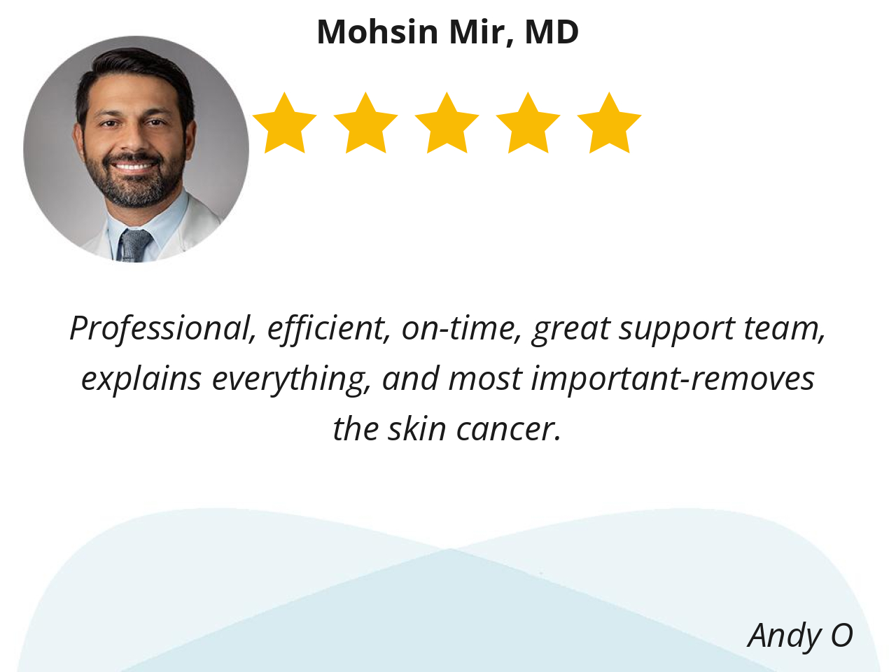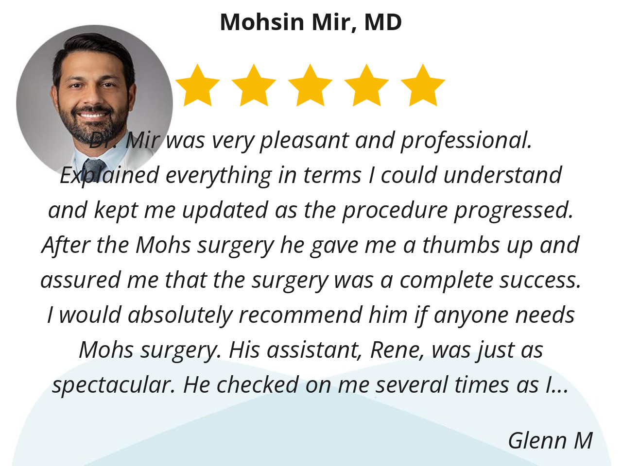 Long time patient of Dr. Mir. All MOHS surgeries have been successful. Great staff support;; very efficient and capable.