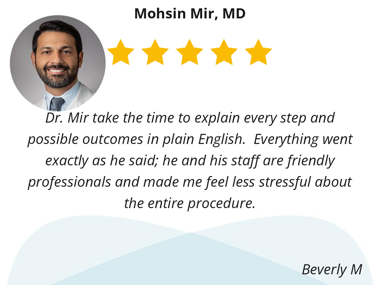 Dr. Mir take the time to explain every step and possible outcomes in plain English. Everything went exactly as he said; he and his staff are friendly professionals and made me feel less stressful about the entire procedure.