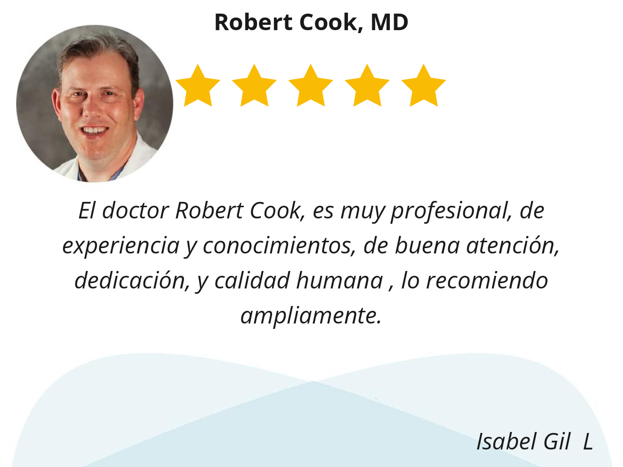 El doctor Robert Cook, es muy profesional, de experiencia y conocimientos, de buena atención, dedicación, y calidad humana , lo recomiendo ampliamente.