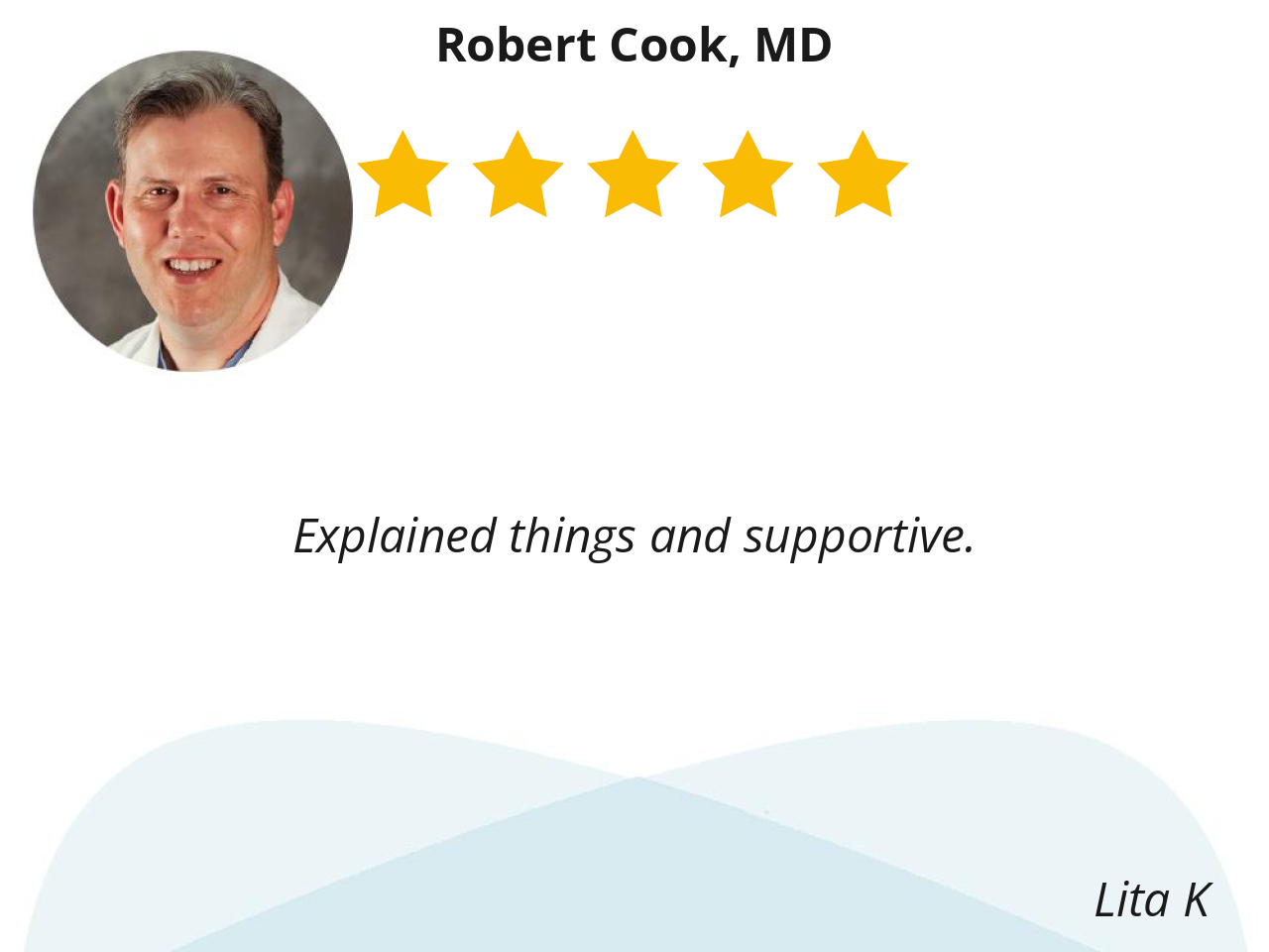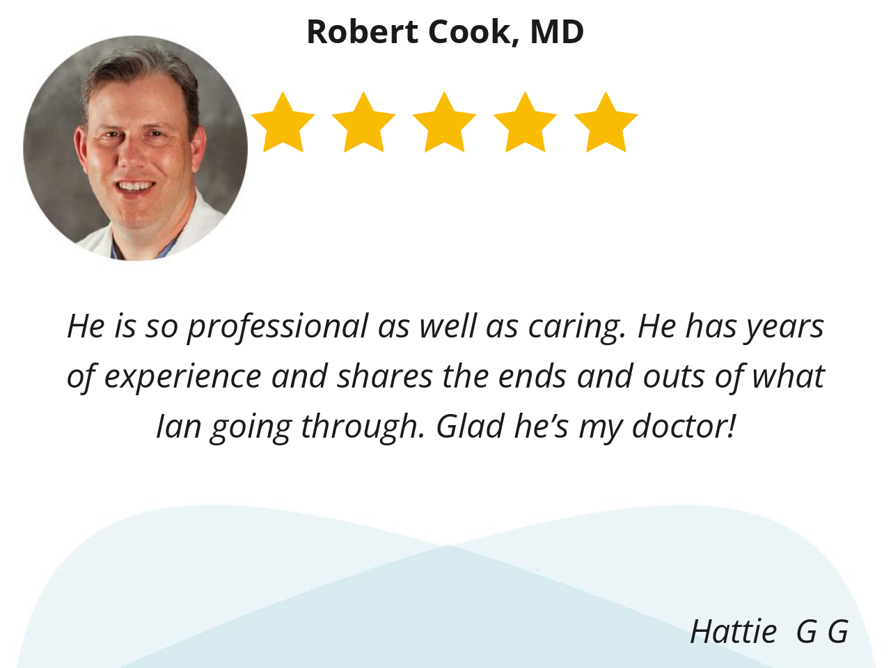 Dr Cook was professional, informative skilled and very kind. He was never rushed and he took the time required to answer all my questions and concerns. His entire staff were efficient and personable and they all appeared to work well together to create a positive experience for his patients.