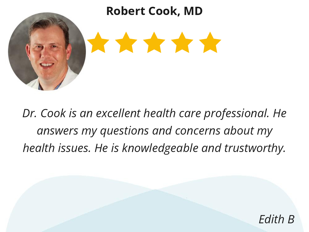 Dr. Cook is an excellent health care professional. He answers my questions and concerns about my health issues. He is knowledgeable and trustworthy.