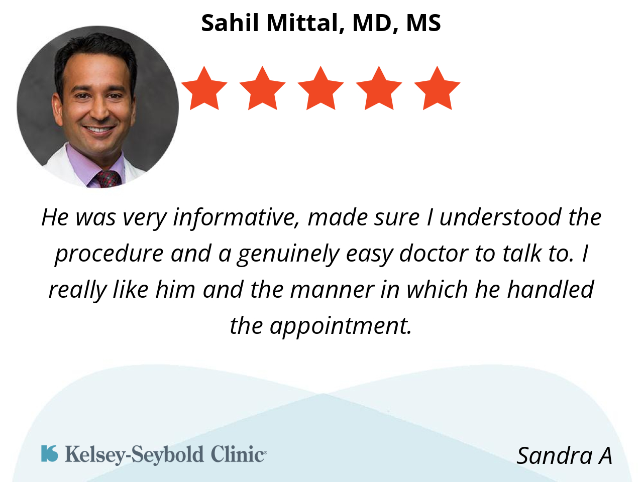 Dr Mittal zeroed in on my multiple issues and quickly determined next steps for a treatment plan. He runs on time, is efficient, direct, and personable. I left feeling confident that I was in good hands.