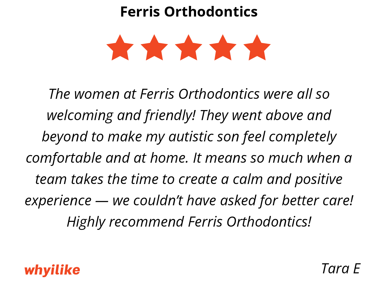 The women at Ferris Orthodontics were all so welcoming and friendly! They went above and beyond to make my autistic son feel completely comfortable and at home. It means so much when a team takes the time to create a calm and positive experience — we couldn’t have asked for better care! Highly recommend Ferris Orthodontics!