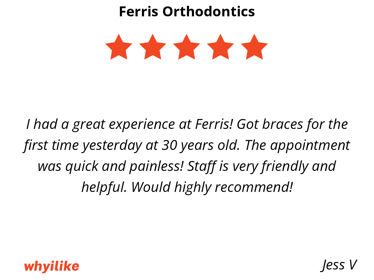 I had a great experience at Ferris! Got braces for the first time yesterday at 30 years old. The appointment was quick and painless! Staff is very friendly and helpful. Would highly recommend!