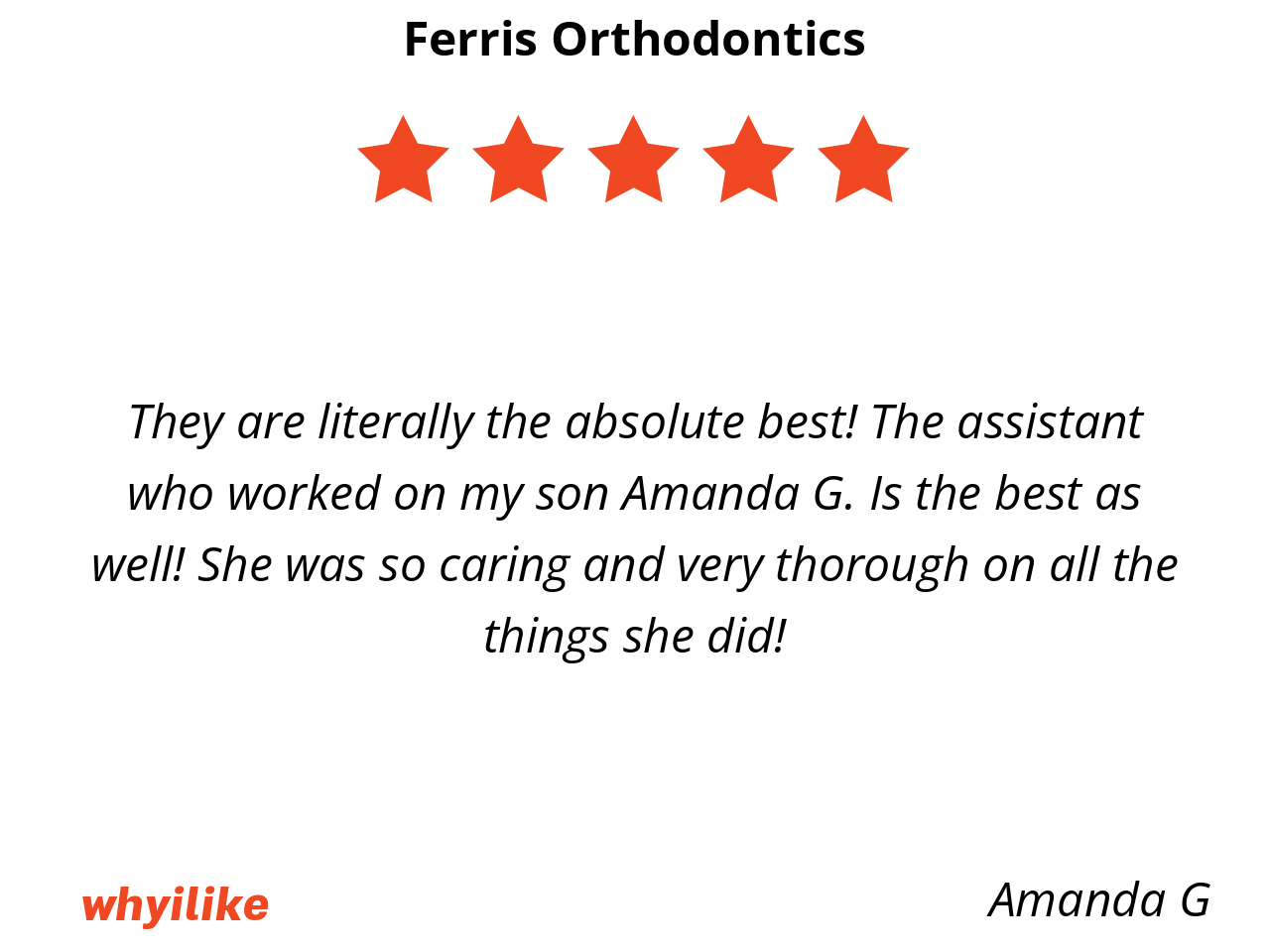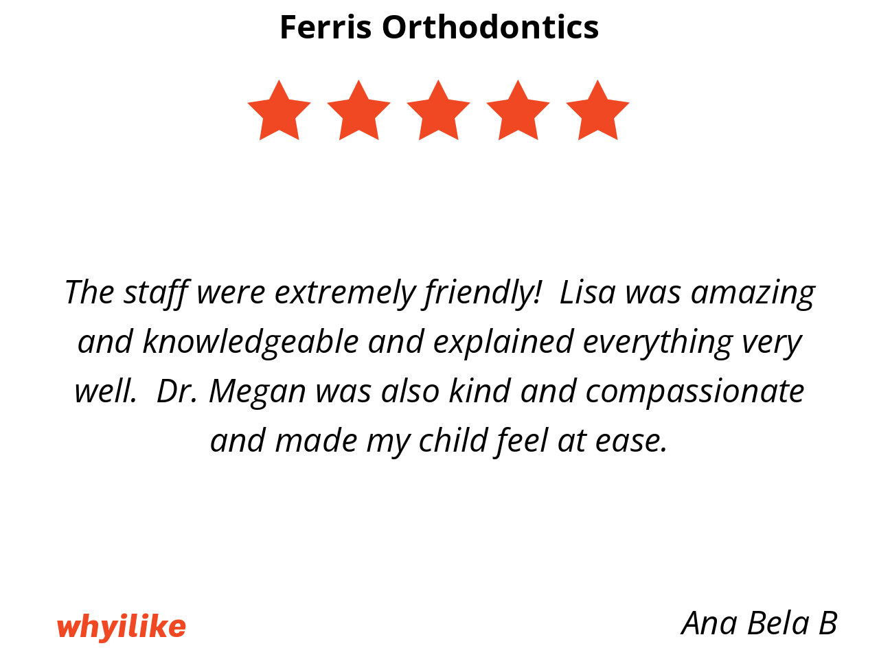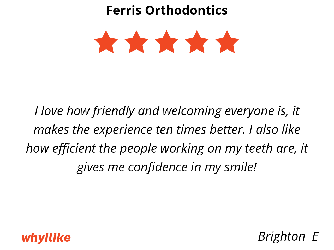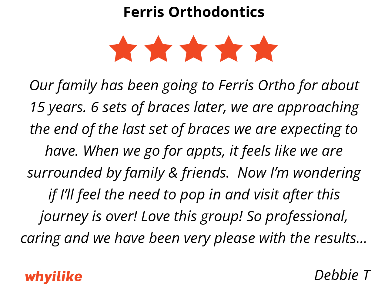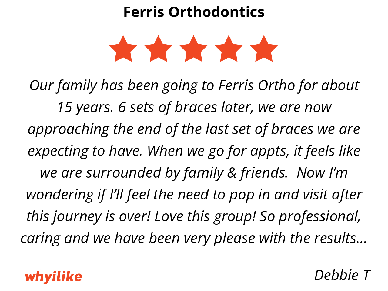 Our family has been going to Ferris Ortho for about 15 years. 6 sets of braces later, we are now approaching the end of the last set of braces we are expecting to have. When we go for appts, it feels like we are surrounded by family & friends. Now I’m wondering if I’ll feel the need to pop in and visit after this journey is over! Love this group! So professional, caring and we have been very please with the results of our new smiles.