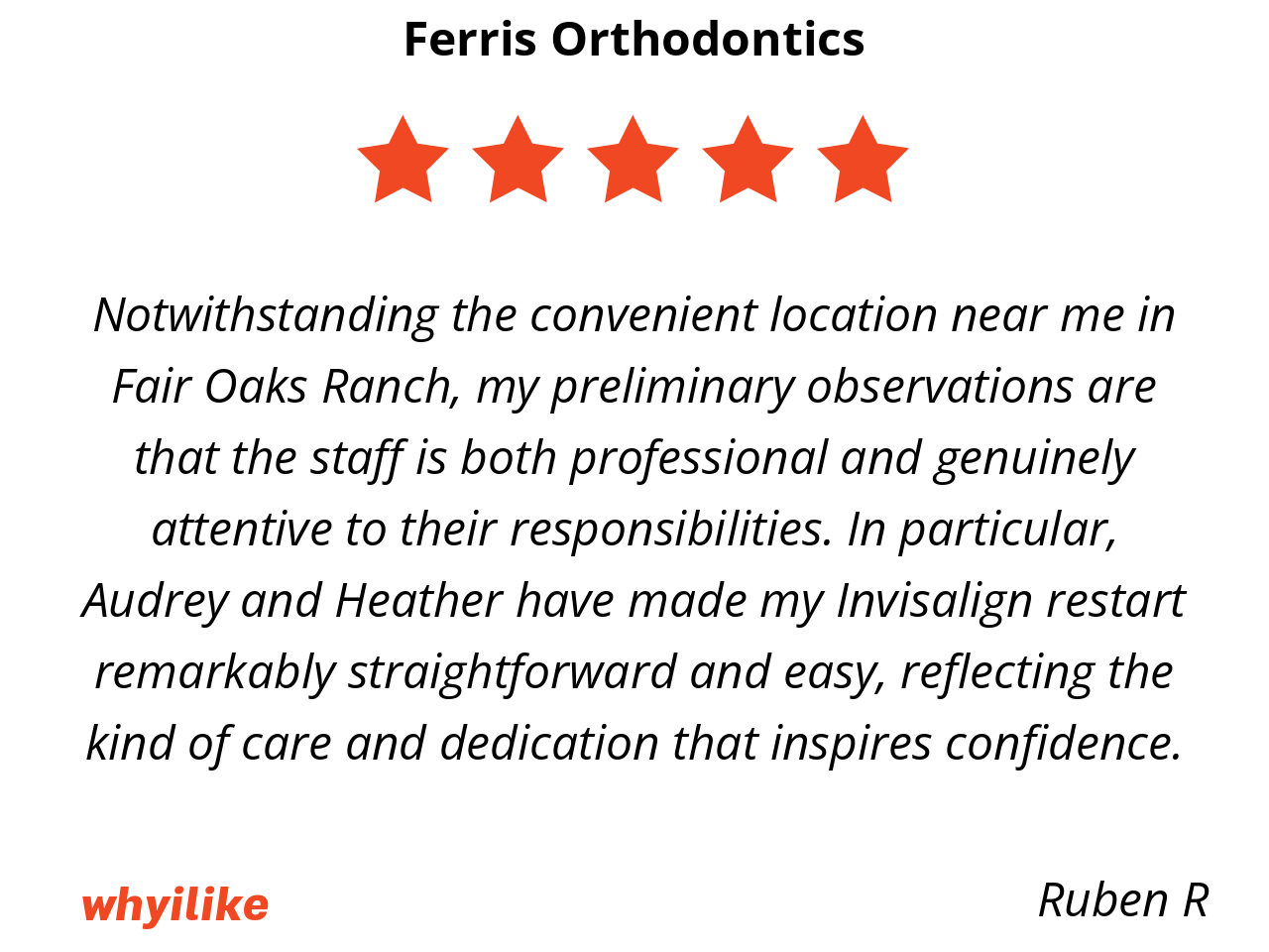 Notwithstanding the convenient location near me in Fair Oaks Ranch, my preliminary observations are that the staff is both professional and genuinely attentive to their responsibilities. In particular, Audrey and Heather have made my Invisalign restart remarkably straightforward and easy, reflecting the kind of care and dedication that inspires confidence.