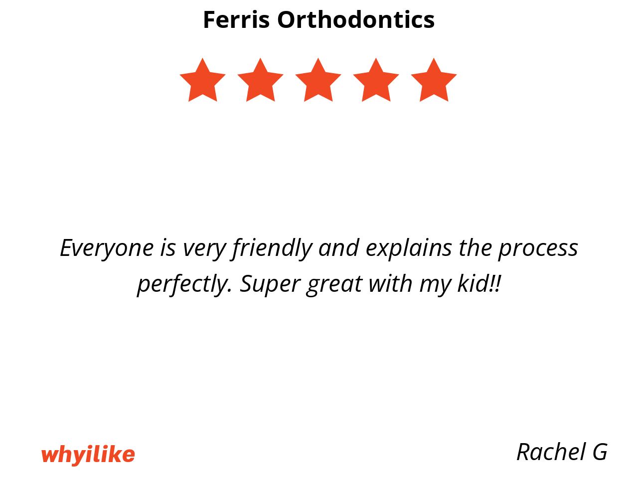 Ferris Orthodontics is easy to schedule and the Doctors are all great! The office staff is always welcoming a friendly. With 2 middle schoolers in braces, scheduling can get tricky with their classes and extra curriculars but we have yet to run into any issues here. I also appreciate how the doctors take time to answer my questions and put me at ease.