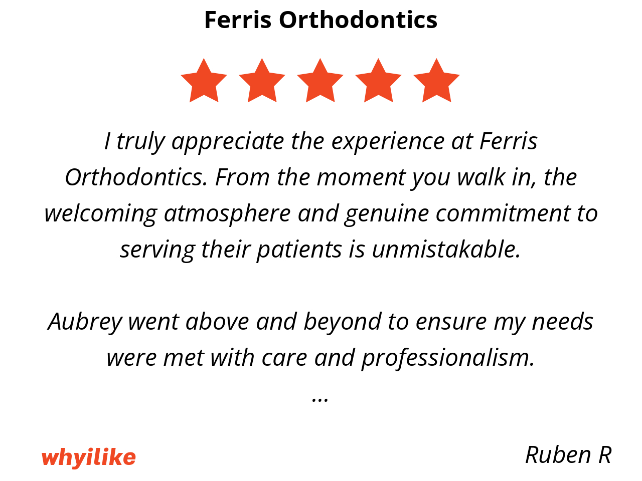 I truly appreciate the experience at Ferris Orthodontics. From the moment you walk in, the welcoming atmosphere and genuine commitment to serving their patients is unmistakable.