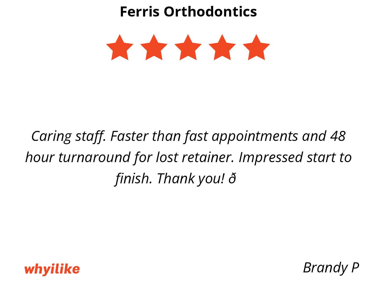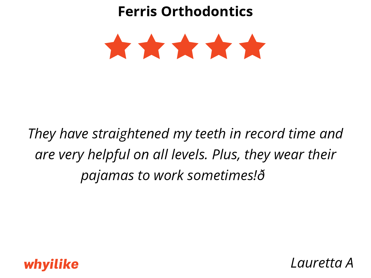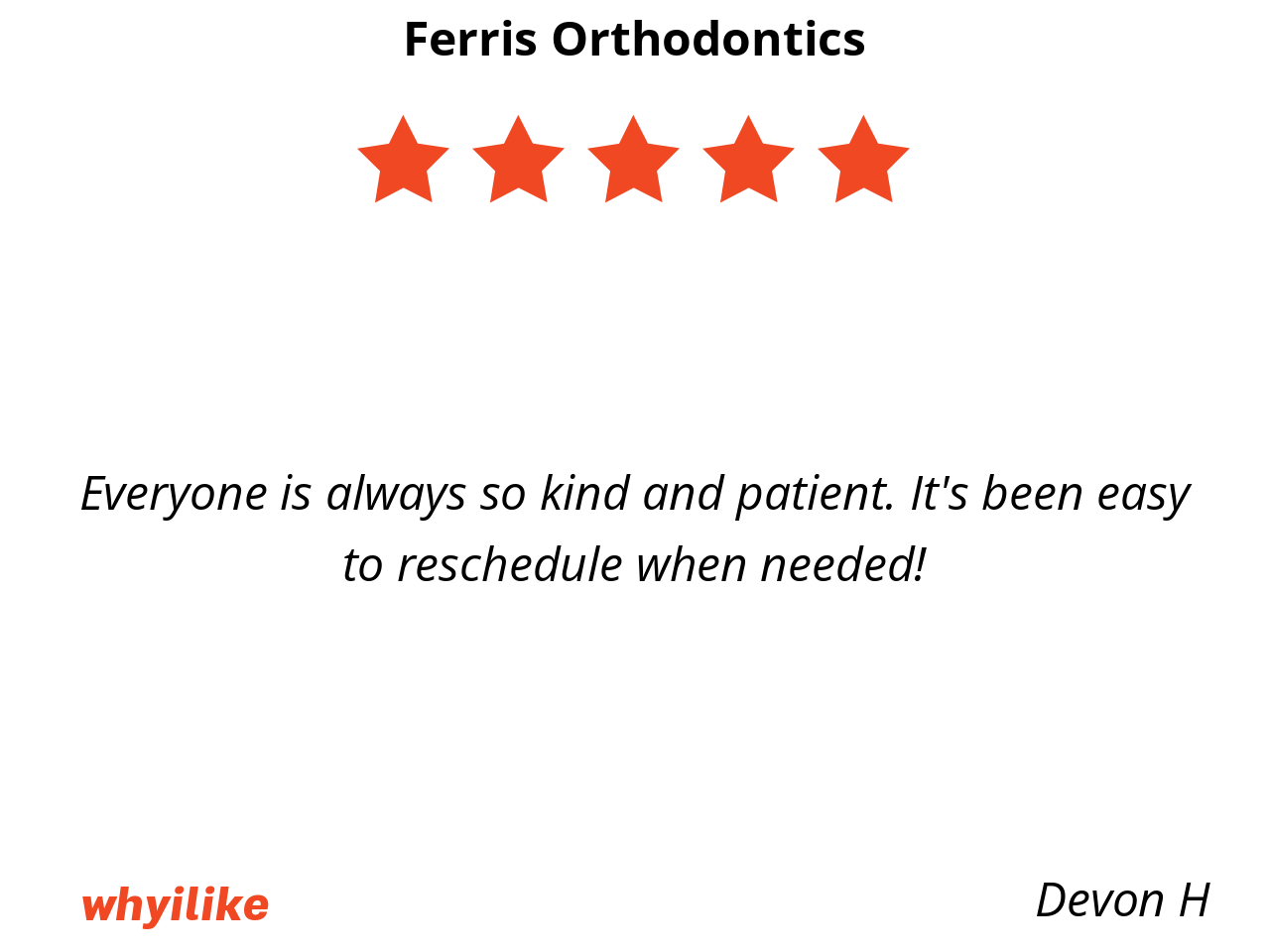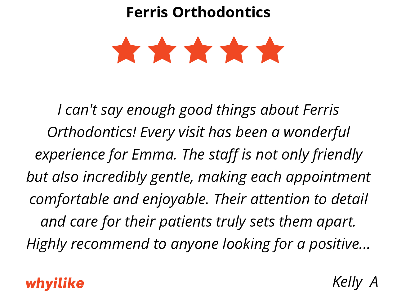 I can't say enough good things about Ferris Orthodontics! Every visit has been a wonderful experience for Emma. The staff is not only friendly but also incredibly gentle, making each appointment comfortable and enjoyable. Their attention to detail and care for their patients truly sets them apart. Highly recommend to anyone looking for a positive orthodontic experience!