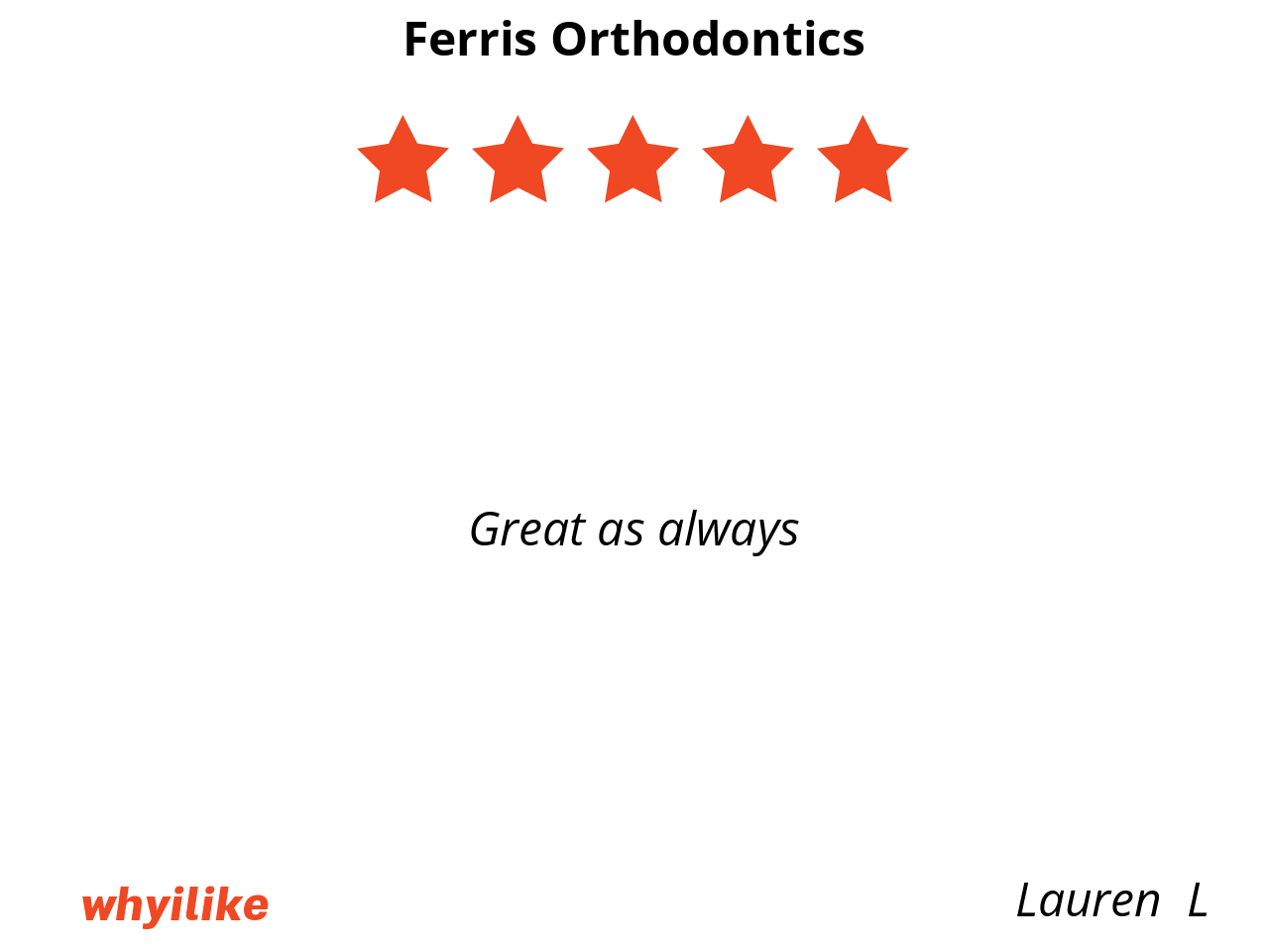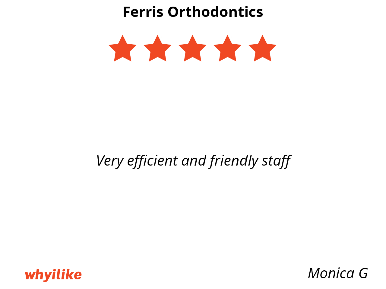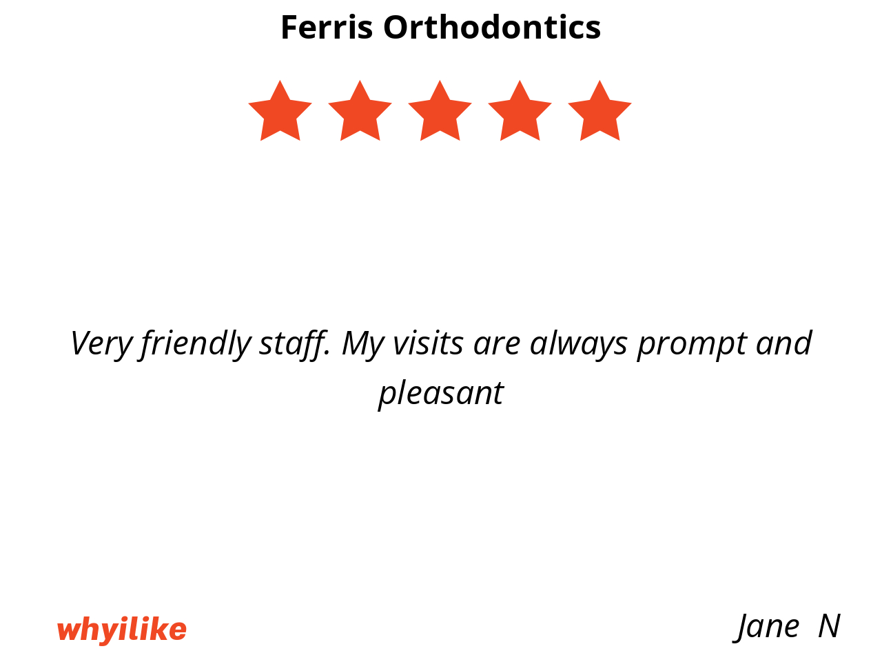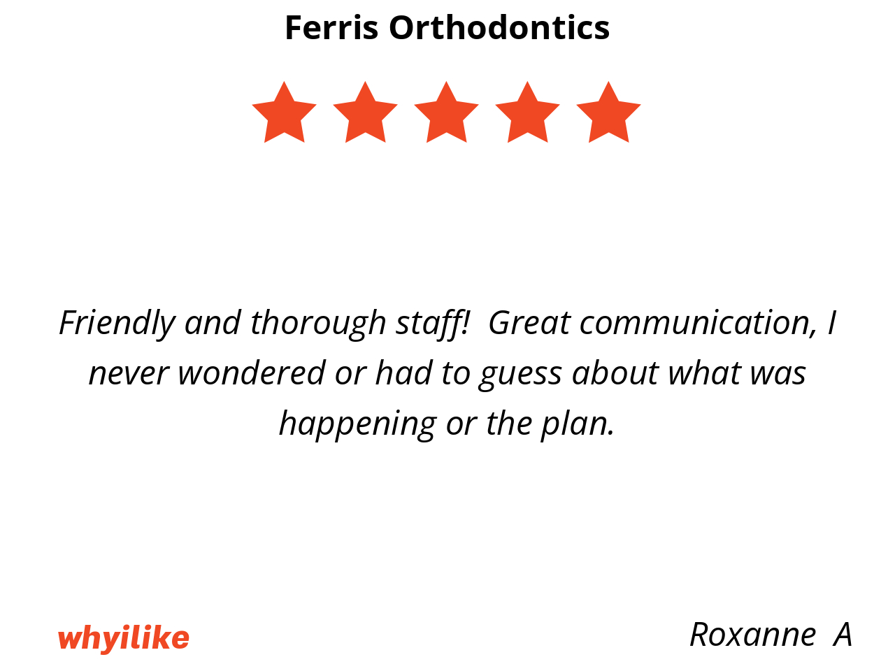 I can't say enough good things about Ferris Orthodontics! Every visit has been a wonderful experience for Emma. The staff is not only friendly but also incredibly gentle, making each appointment comfortable and enjoyable. Their attention to detail and care for their patients truly sets them apart. Highly recommend to anyone looking for a positive orthodontic experience!