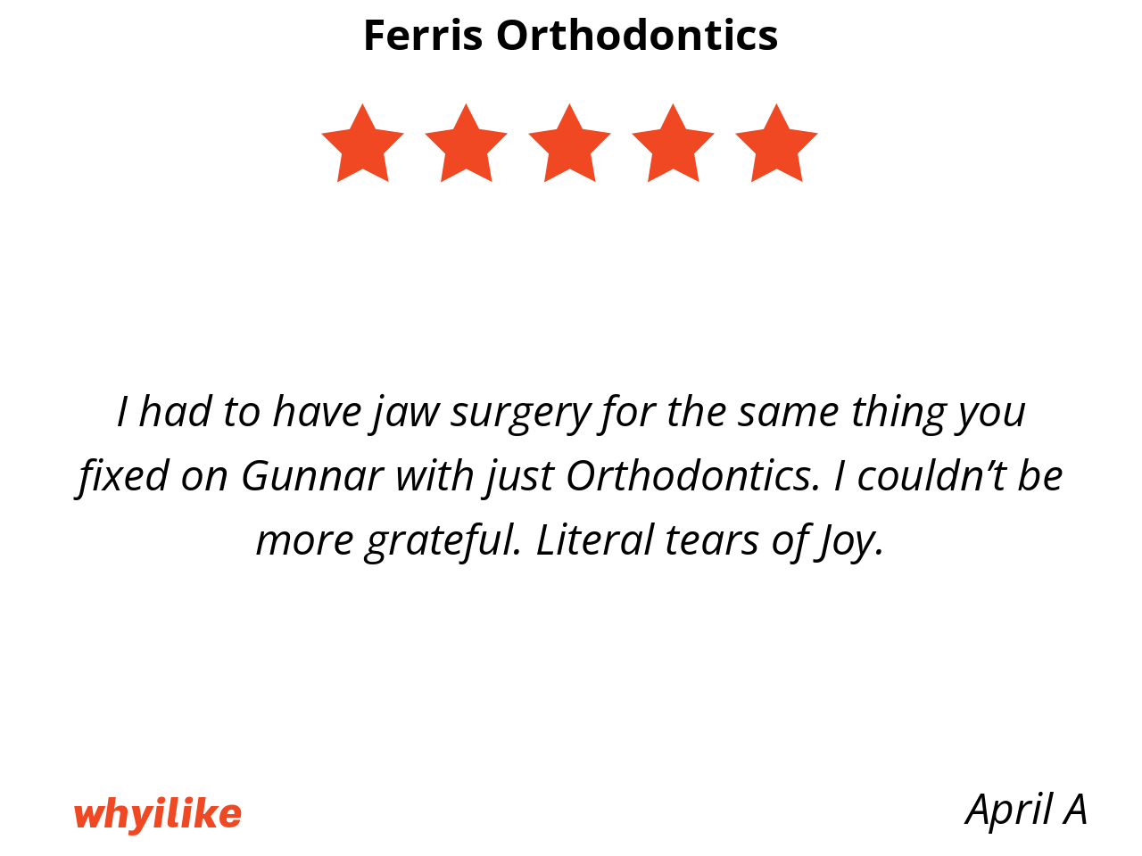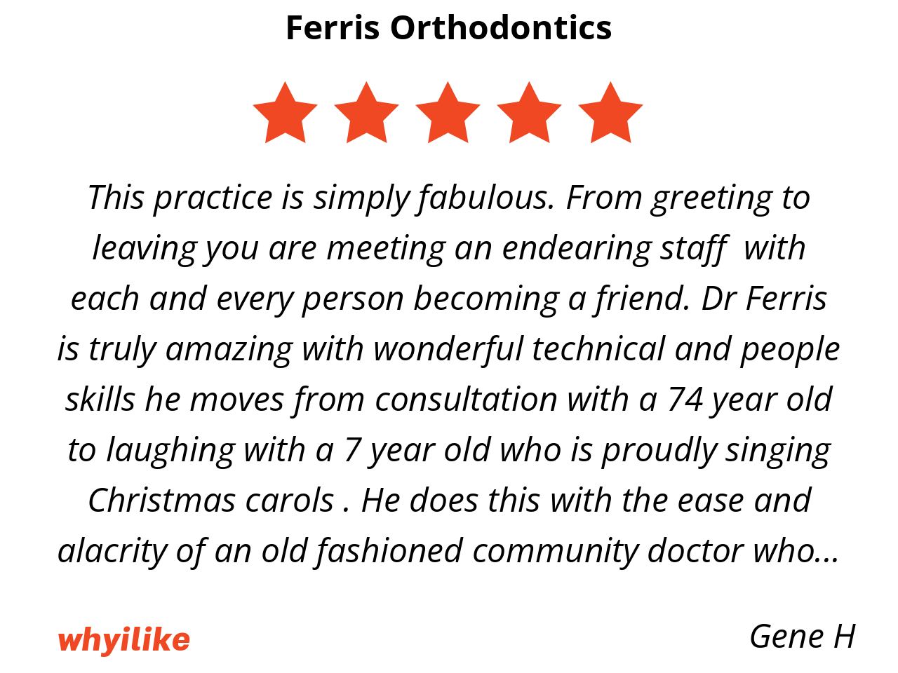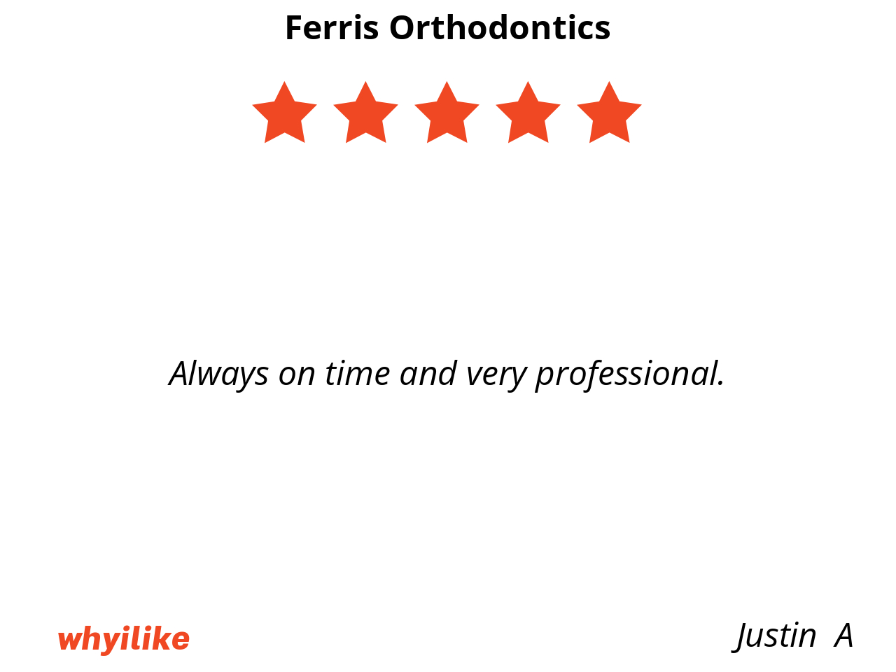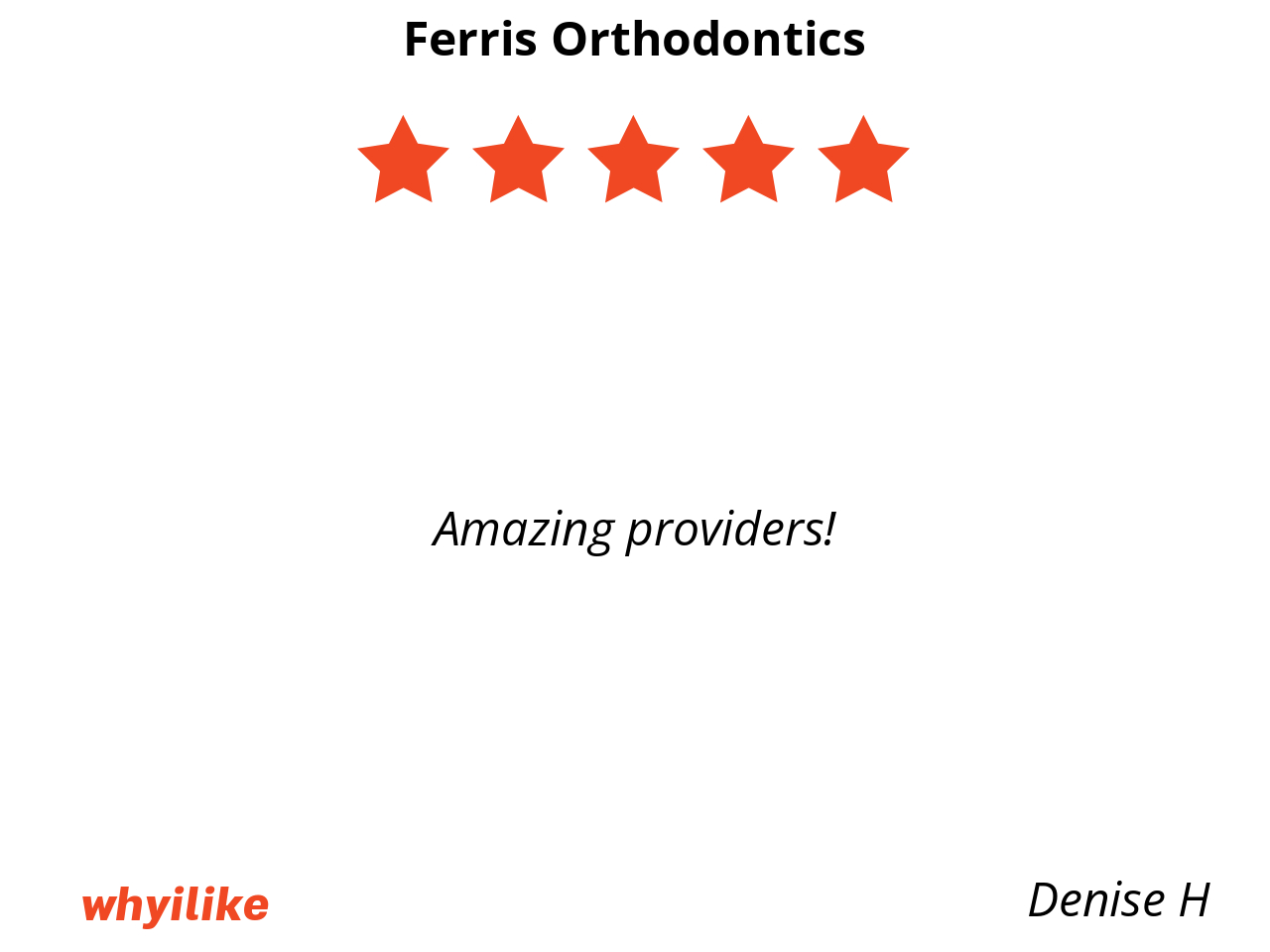 I can't say enough good things about Ferris Orthodontics! Every visit has been a wonderful experience for Emma. The staff is not only friendly but also incredibly gentle, making each appointment comfortable and enjoyable. Their attention to detail and care for their patients truly sets them apart. Highly recommend to anyone looking for a positive orthodontic experience!