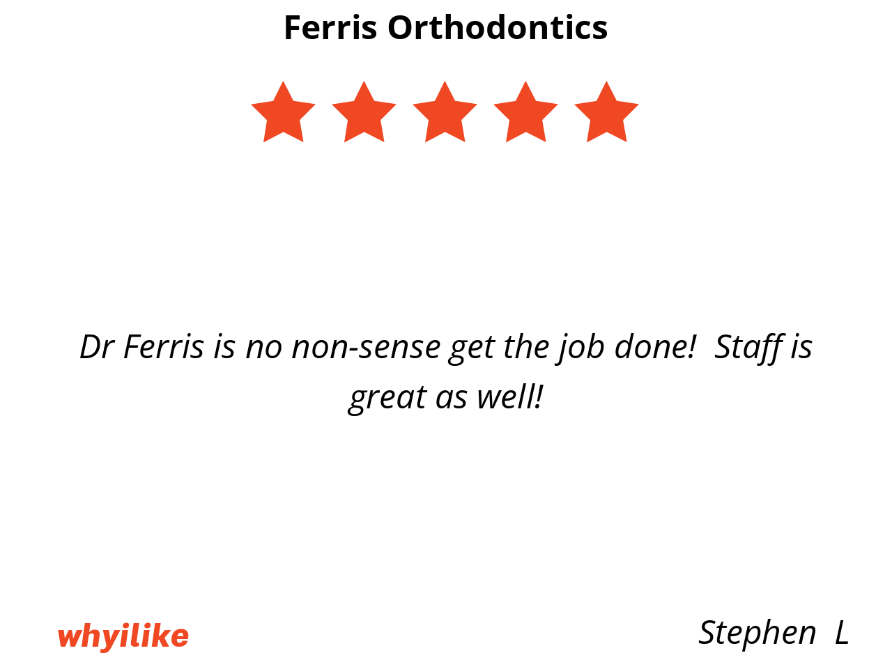 Dr. Ferris and his team have been nothing but professional, compassionate, on time, thorough, and simply fun to be around. Dr. Ferris’ expertise is second to none. He explains the current state of your teeth and alignment as well as the next steps in your plan to get your smile as perfect as it can be. I can’t give Dr. Ferris and his staff enough compliments.