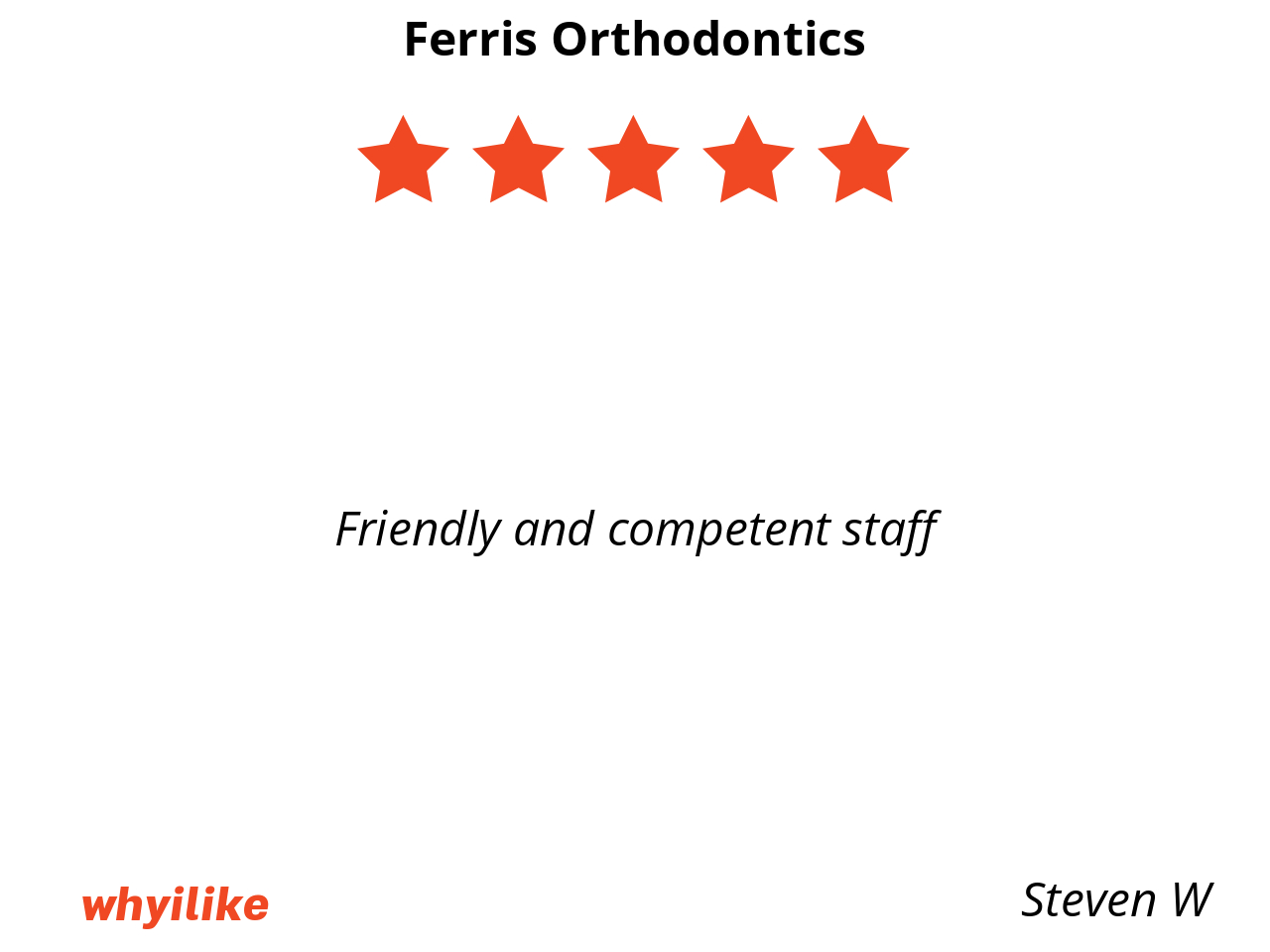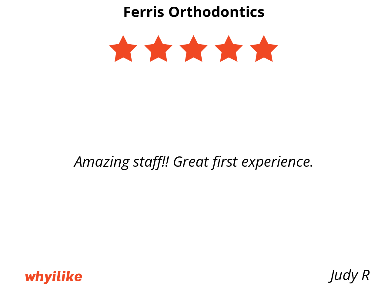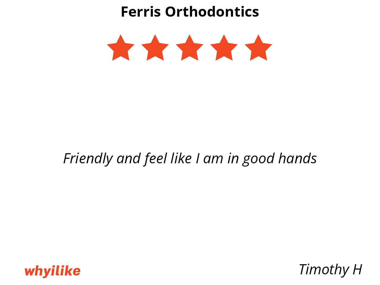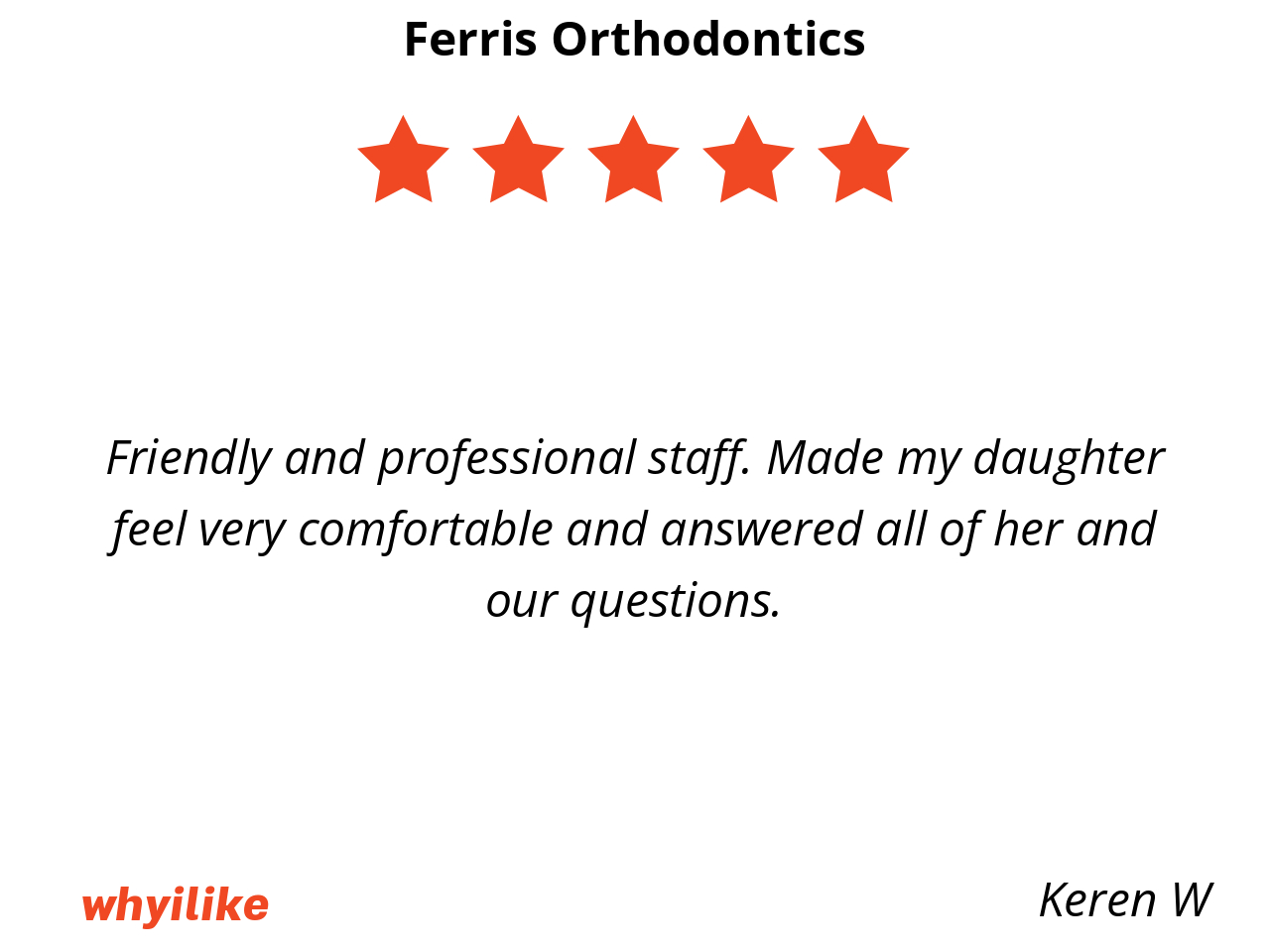 It was my first time here. The staff was friendly, helpful, and knowledgeable. Dr. Ferris took time with me to discuss what I was wanting to accomplish. He shared the details of my options. He genuinely listened, and was quite knowledgeable and helpful. I highly recommend this office for any orthodontic needs. It was a great experience.
