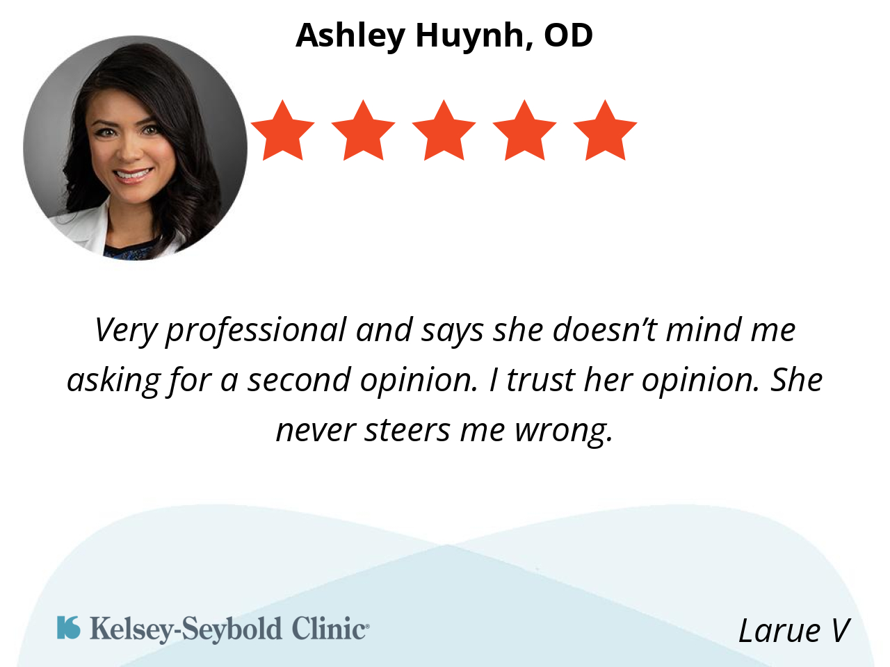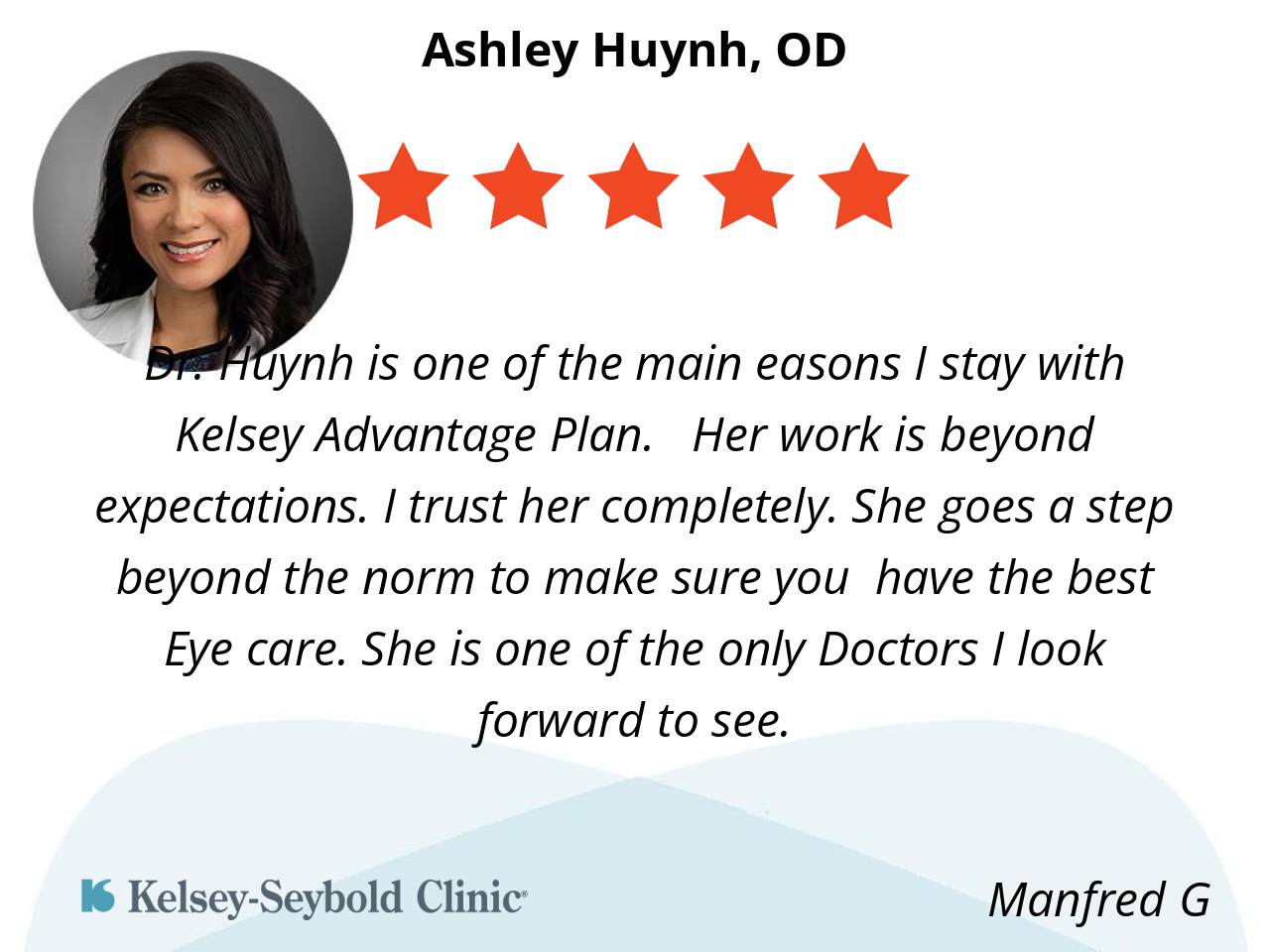 Dr. Huynh is one of the main easons I stay with Kelsey Advantage Plan. Her work is beyond expectations. I trust her completely. She goes a step beyond the norm to make sure you have the best Eye care. She is one of the only Doctors I look forward to see.